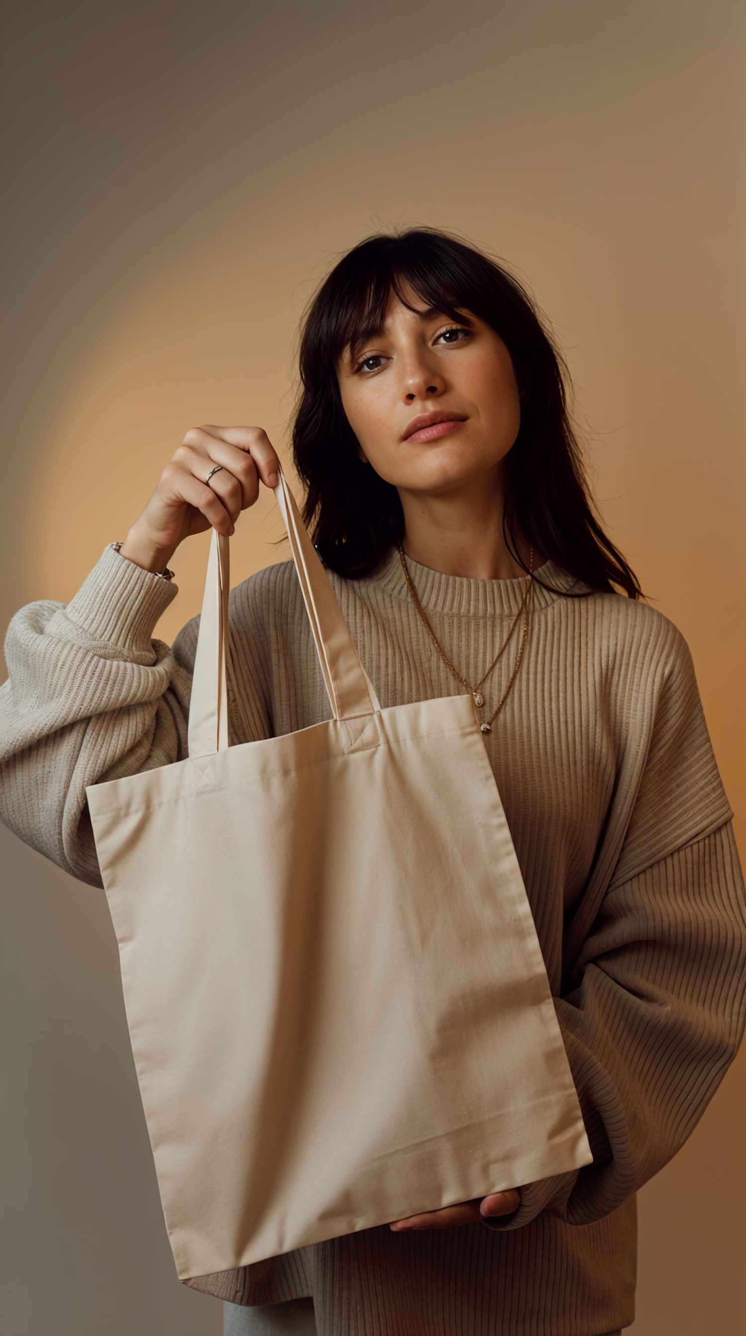 Young woman with dark hair holding a beige tote bag, wearing a ribbed sweater against a warm-toned background.