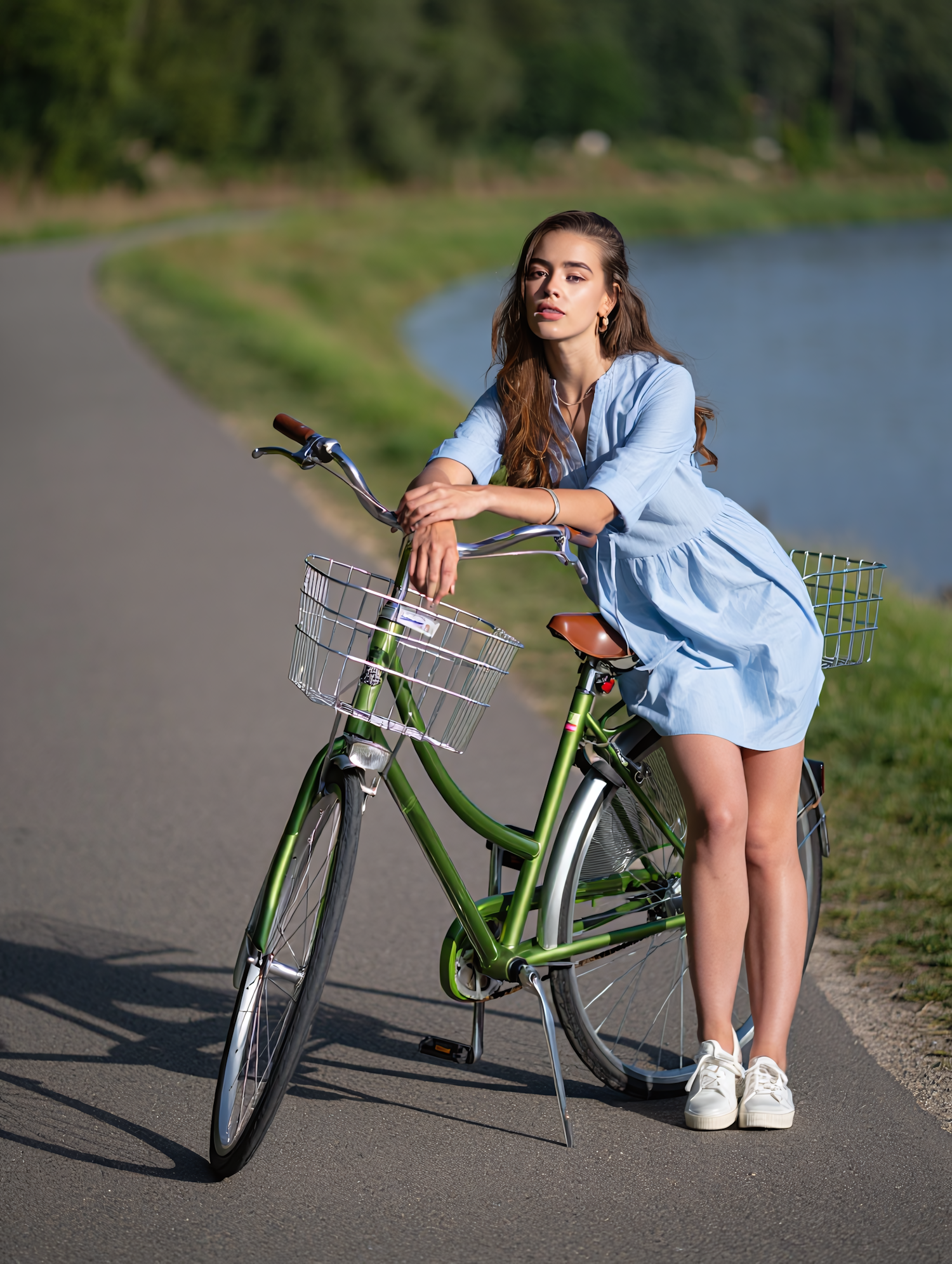 A woman in a light blue dress leans on a green bicycle by a peaceful riverside path, enjoying a sunny day outdoors.