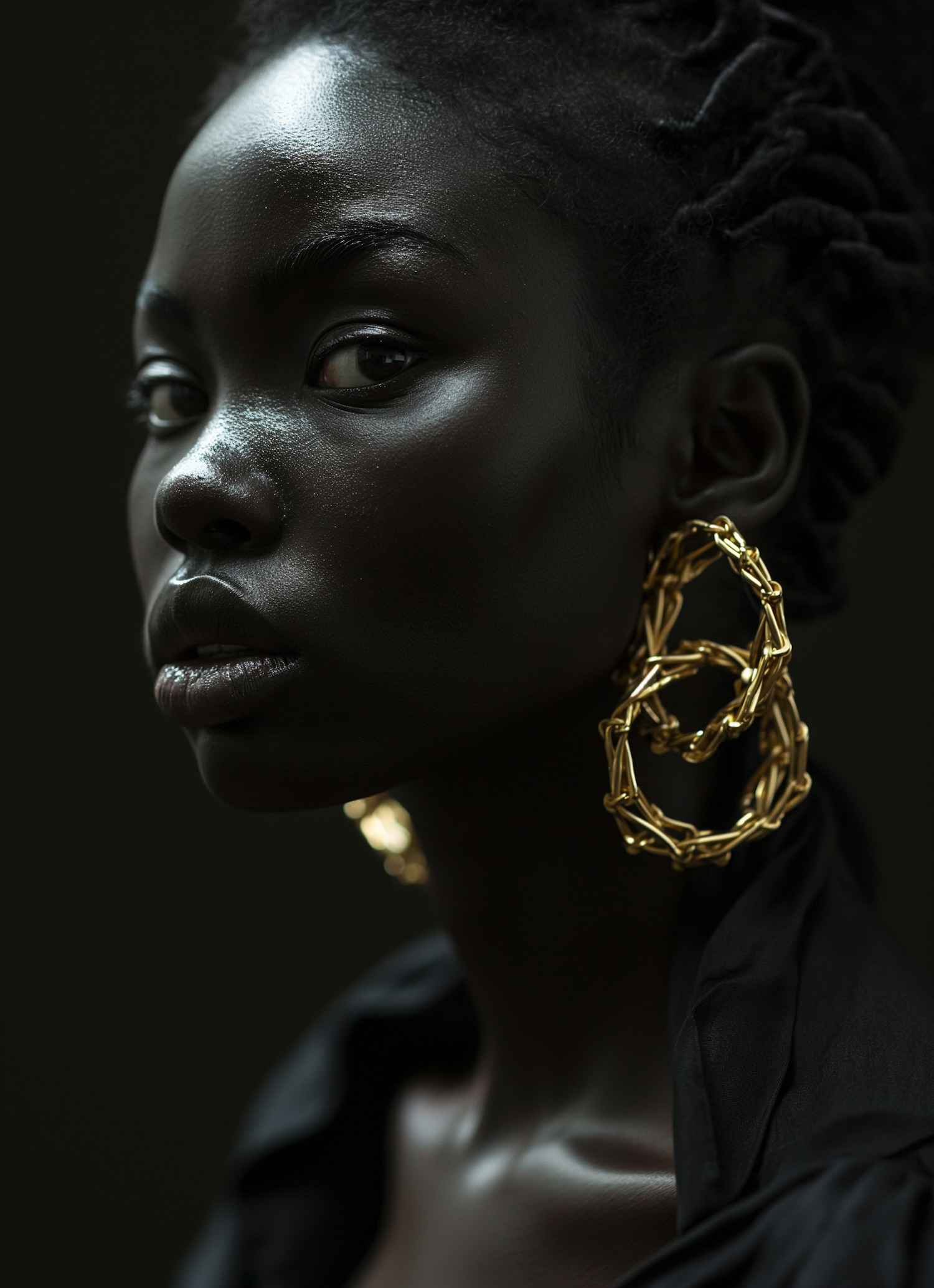 Close-up portrait of a Black woman with gold earrings, highlighting her smooth skin and intricate hair twists against a dark background.