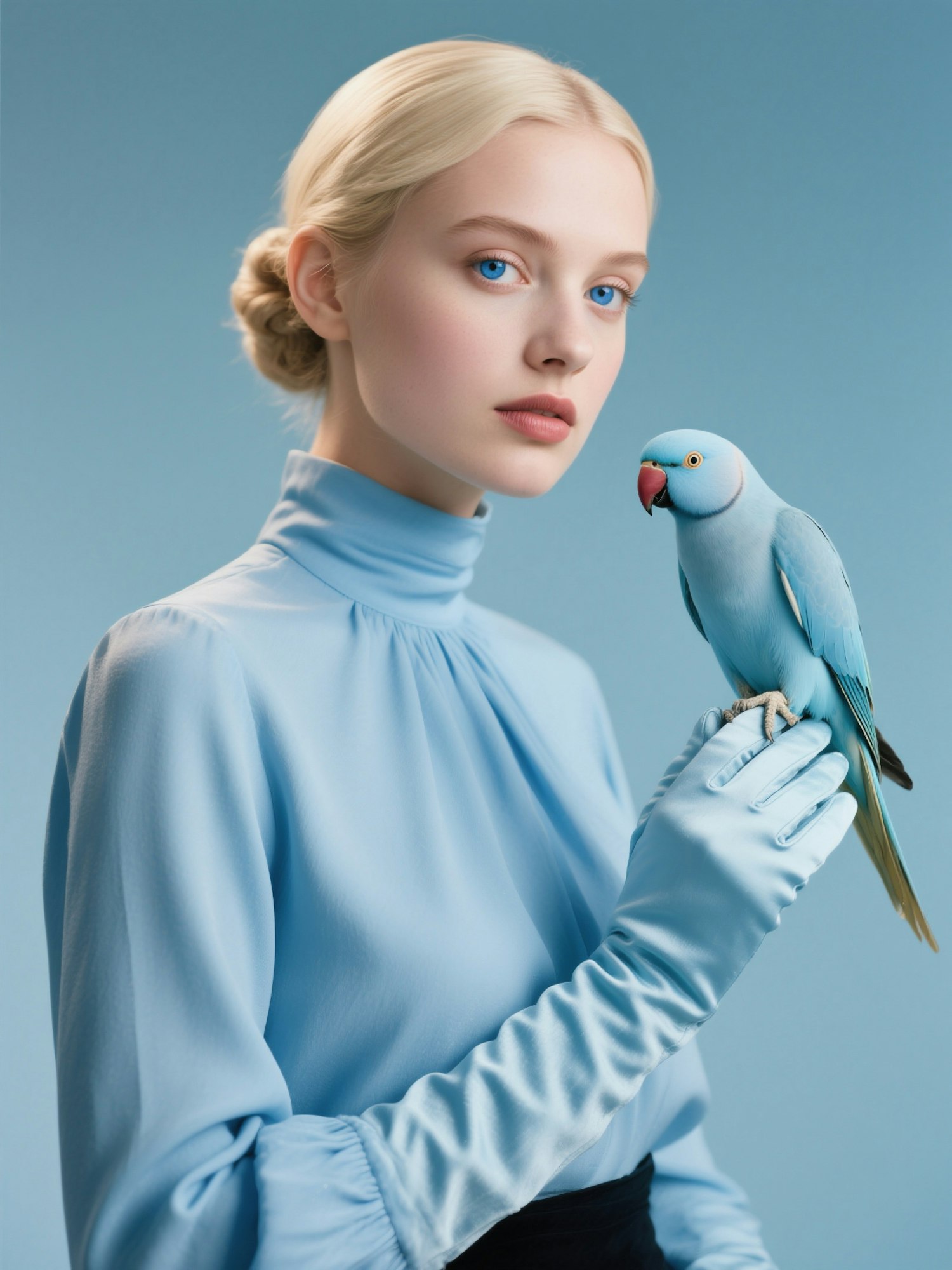 high fashion editorial portrait of a woman, perfect glossy skin, warm soft lighting, detailed and expressive composition, rich color accents, dramatic textures, intricate styling, high-end studio photography, cinematic ambiance, 85mm lens, a young fair-skinned woman with pale blonde hair in a low bun, blue eyes, natural makeup, wearing a high-neck powder blue blouse, a pastel blue parrot perched on her gloved hand slightly in front of her, pale blue gradient background