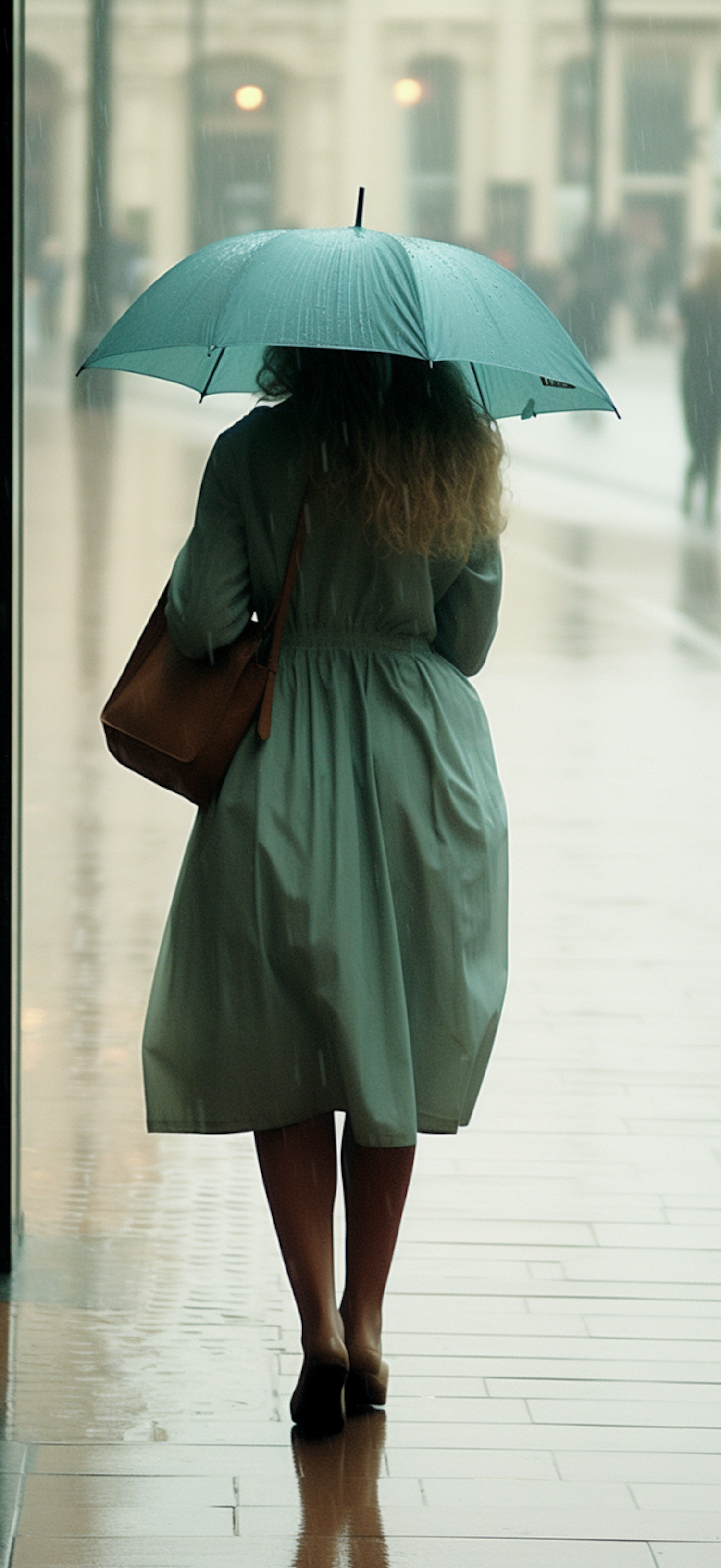 Woman with teal umbrella and coat walks on rainy city street, carrying a brown handbag. Wet pavement reflects soft light.