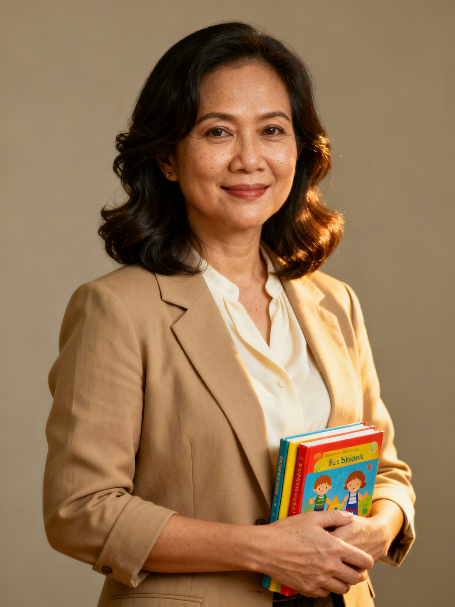 Studio portrait of a Southeast Asian woman primary school teacher in her forties; light-tan skin, warm undertone; shoulder-length dark hair with a soft wave; sand-colored blazer over a cream blouse; neat stack of two small colorful children’s books held at the hip; neutral seamless backdrop; Rembrandt lighting; 105mm macro-sharp detail; photorealistic, editorial. Expression: warm professionalism. Negative: “youthifying” skin blur, exaggerated wrinkle removal.