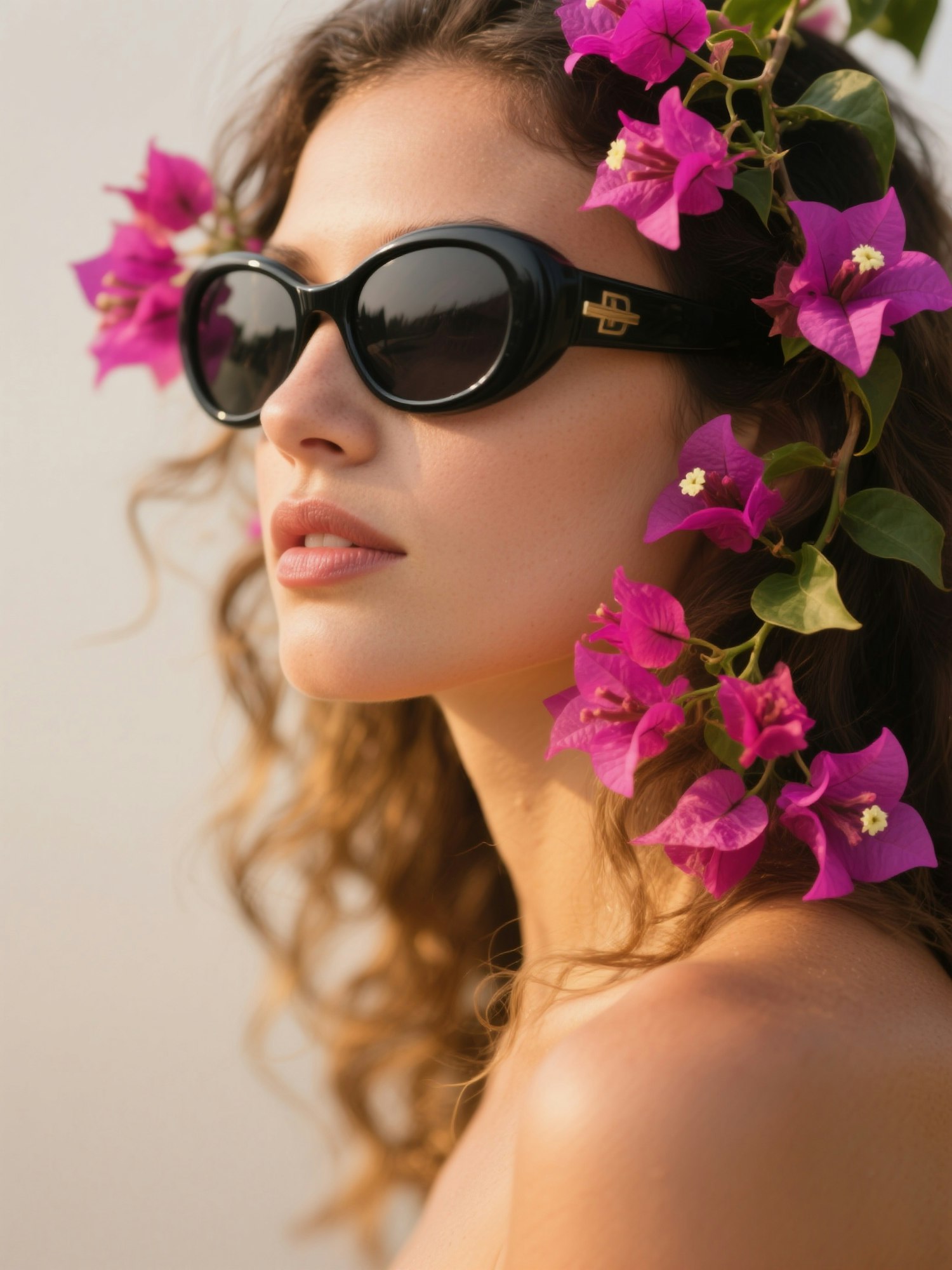 — portrait of a woman with warm golden skin tone and loose wavy hair, wearing oversized black aviator sunglasses, intertwined with vibrant fuchsia bougainvillea flowers, blooms positioned along the frame edges without touching the lenses