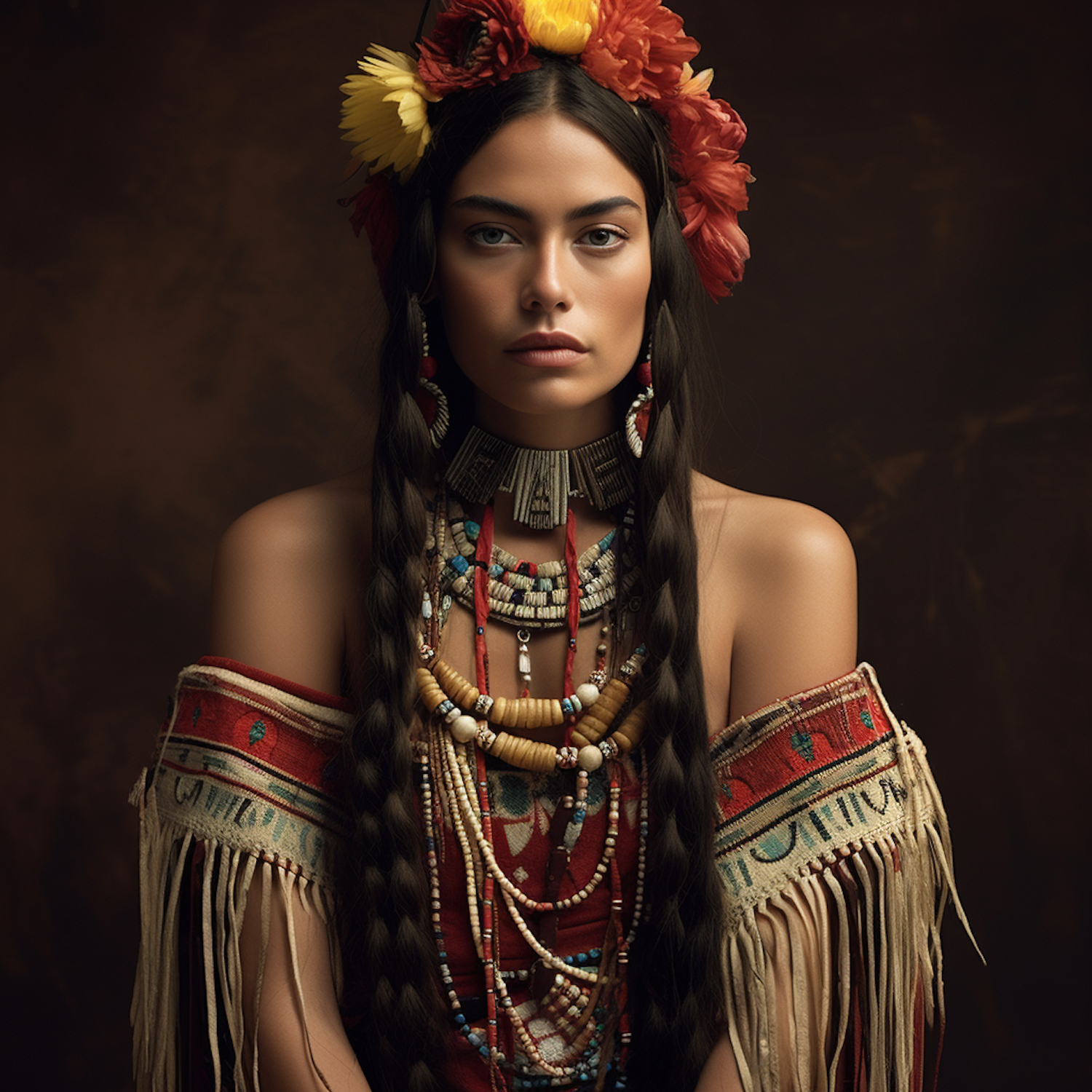 Woman with braided hair and floral headdress in traditional attire, featuring vibrant necklaces and intricate patterns.