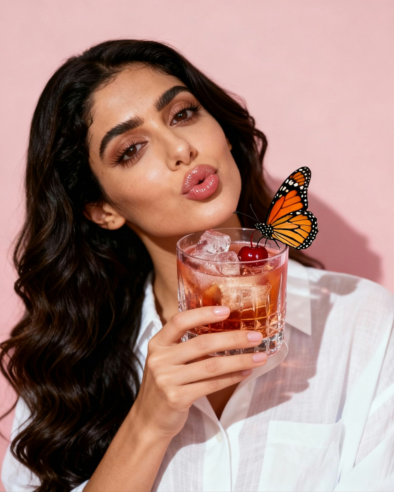 A woman holding a drink with a butterfly perched on it, set against a pink background, creating a vibrant and playful scene.