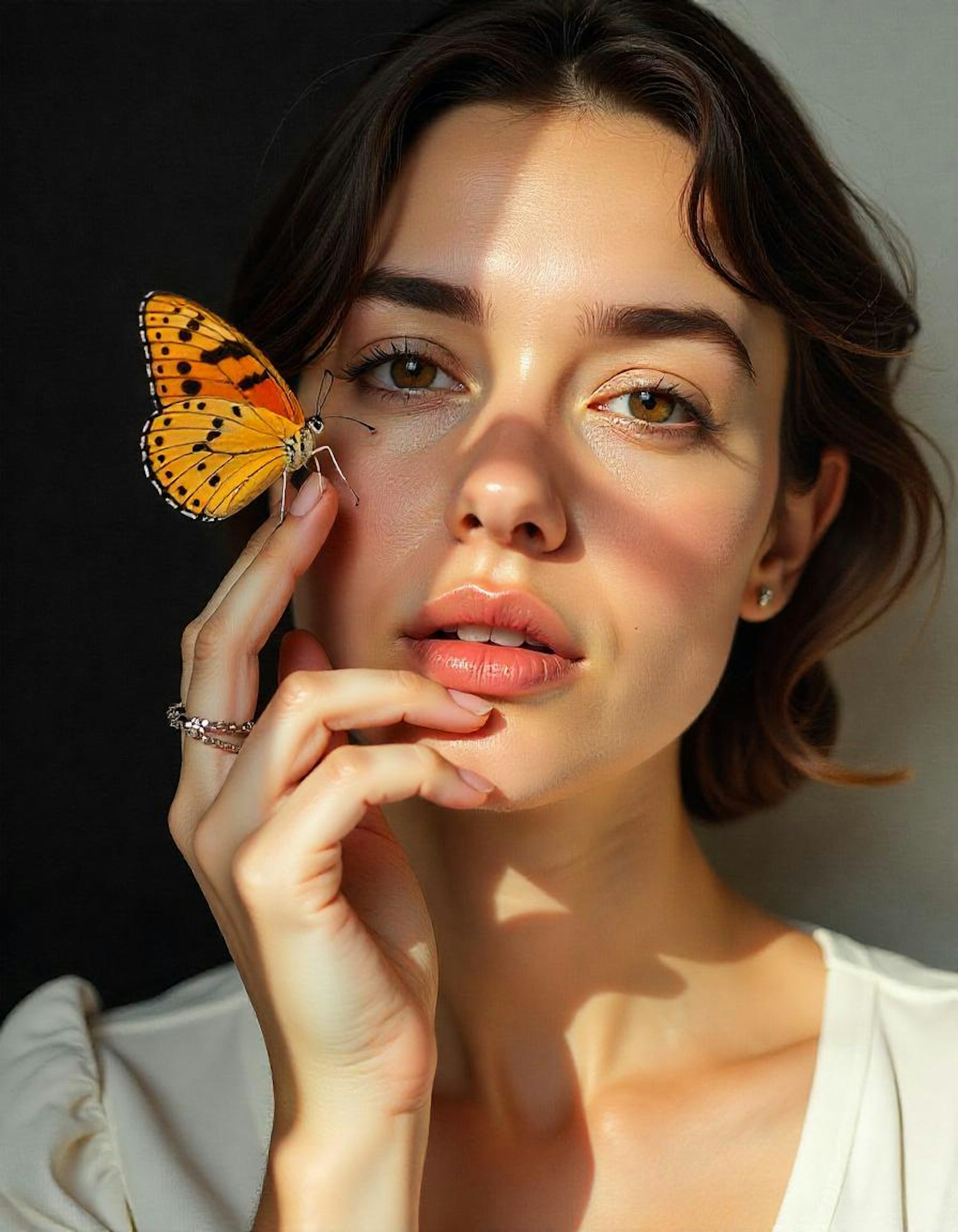A serene woman with a butterfly on her cheek, highlighted by soft lighting and natural beauty.