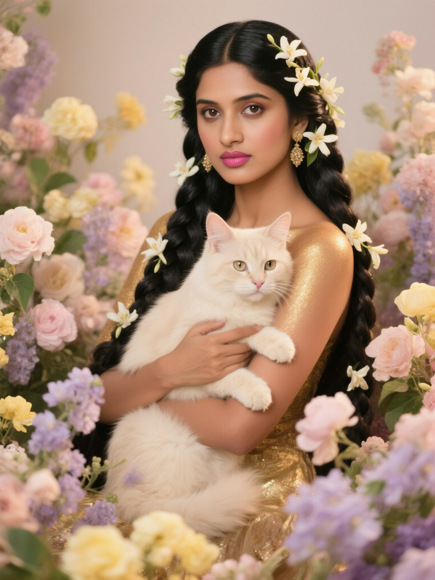 high fashion editorial portrait of a woman, perfect glossy skin, warm soft lighting, rich floral composition, detailed textures, vibrant colors, high-end studio photography, cinematic ambiance, 85mm lens, a South Asian woman with long black hair, jasmine flowers braided into her hair, golden highlighter and pink lips, holding a fluffy cream-colored cat against her chest, surrounded by blooming flowers in soft pastels