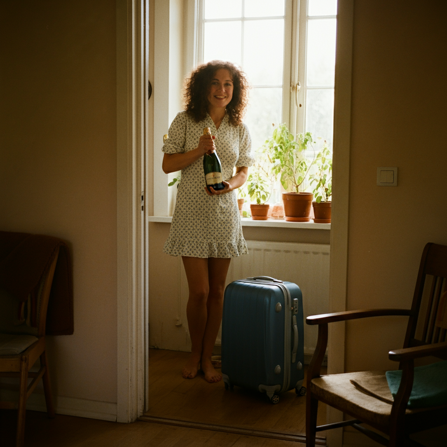 Joyful woman in a patterned dress holding champagne by a blue suitcase in a cozy, plant-filled room.