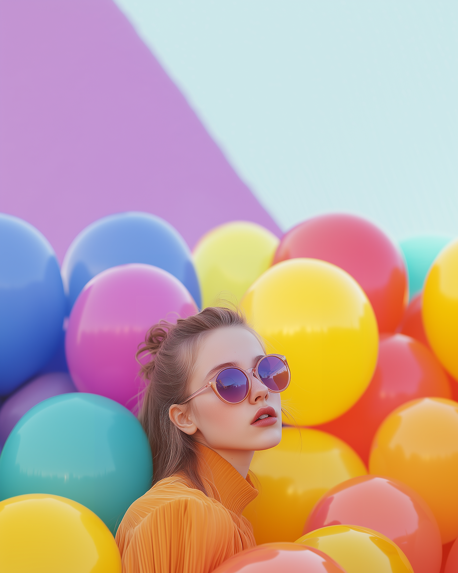 A stylish woman in sunglasses surrounded by colorful balloons, set against a pastel background, creating a vibrant and playful scene.