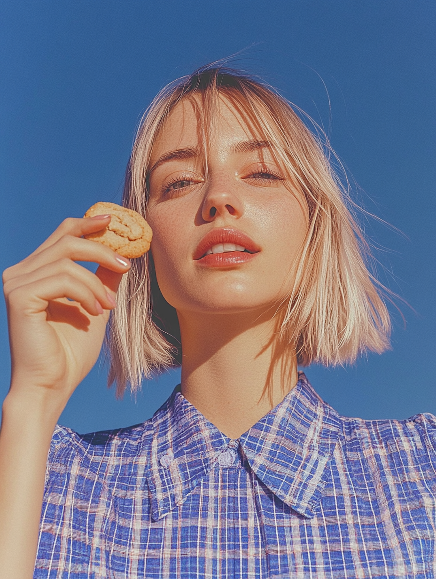 Young woman with blonde bob and plaid shirt holds a cookie against a clear blue sky, exuding a relaxed and stylish vibe.