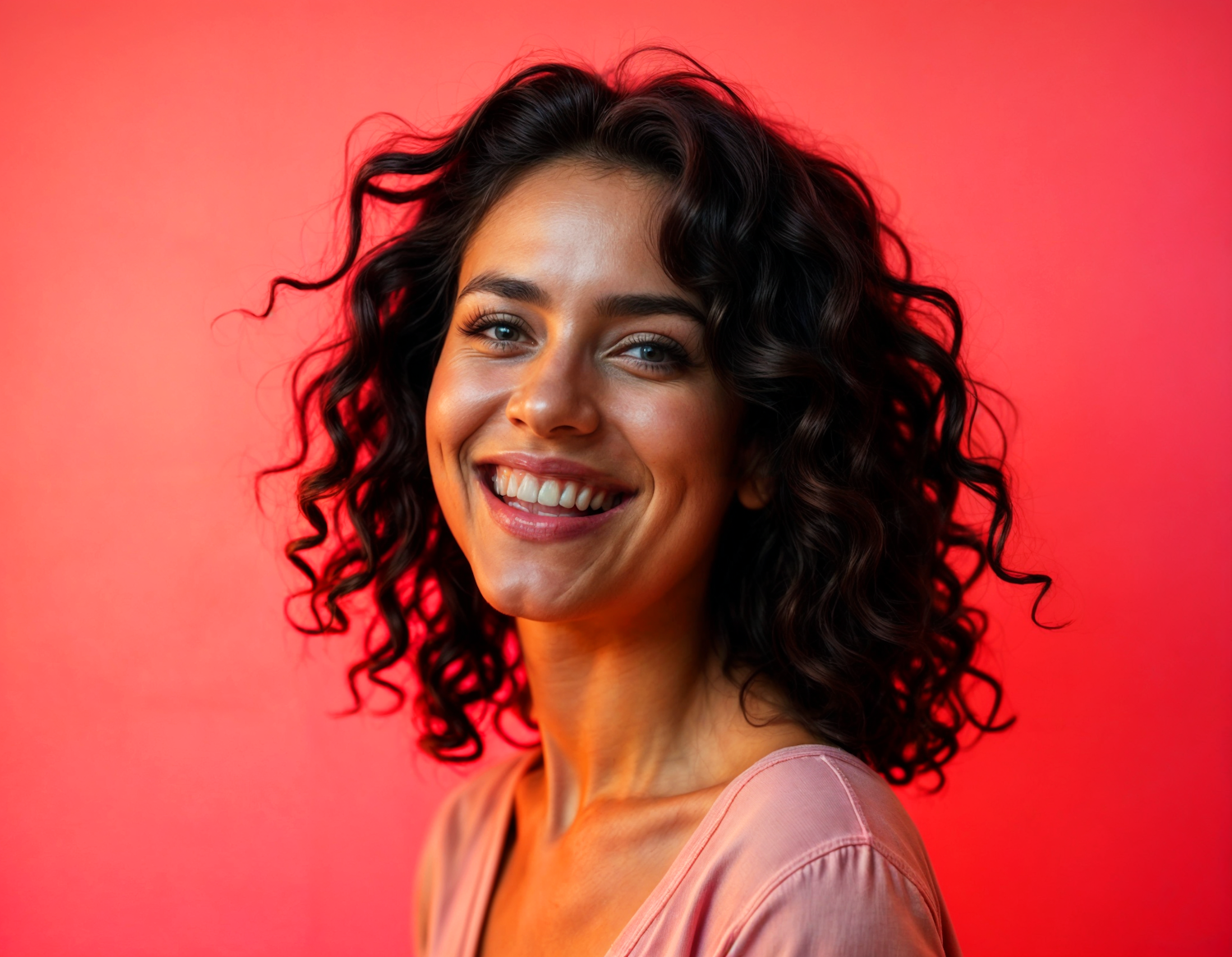 Smiling woman with curly hair against a vibrant red background, wearing a light pink top. Joyful expression and striking blue eyes.