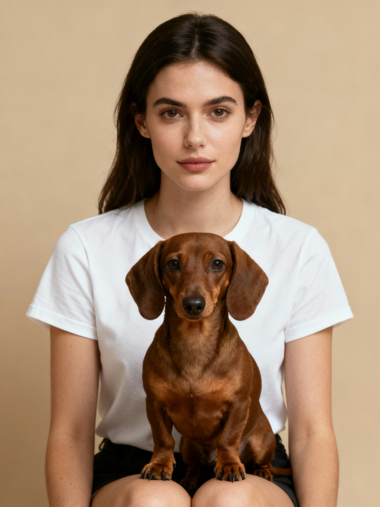 Studio portrait photography of a model with a dog. Soft beige background, perfectly uniform, seamless, no floor line. Flat diffused lighting, shadowless, evenly lit, natural skin tones, warm atmosphere. Minimal and intimate composition, both model and dog close to camera, side by side or gently interacting. Calm expressions, natural styling, no exaggerated posing. High resolution, sharp, simple and authentic mood. A young brunette woman, wearing a plain white t-shirt, sits with a small brown dachshund standing on her lap, both facing the camera directly.
