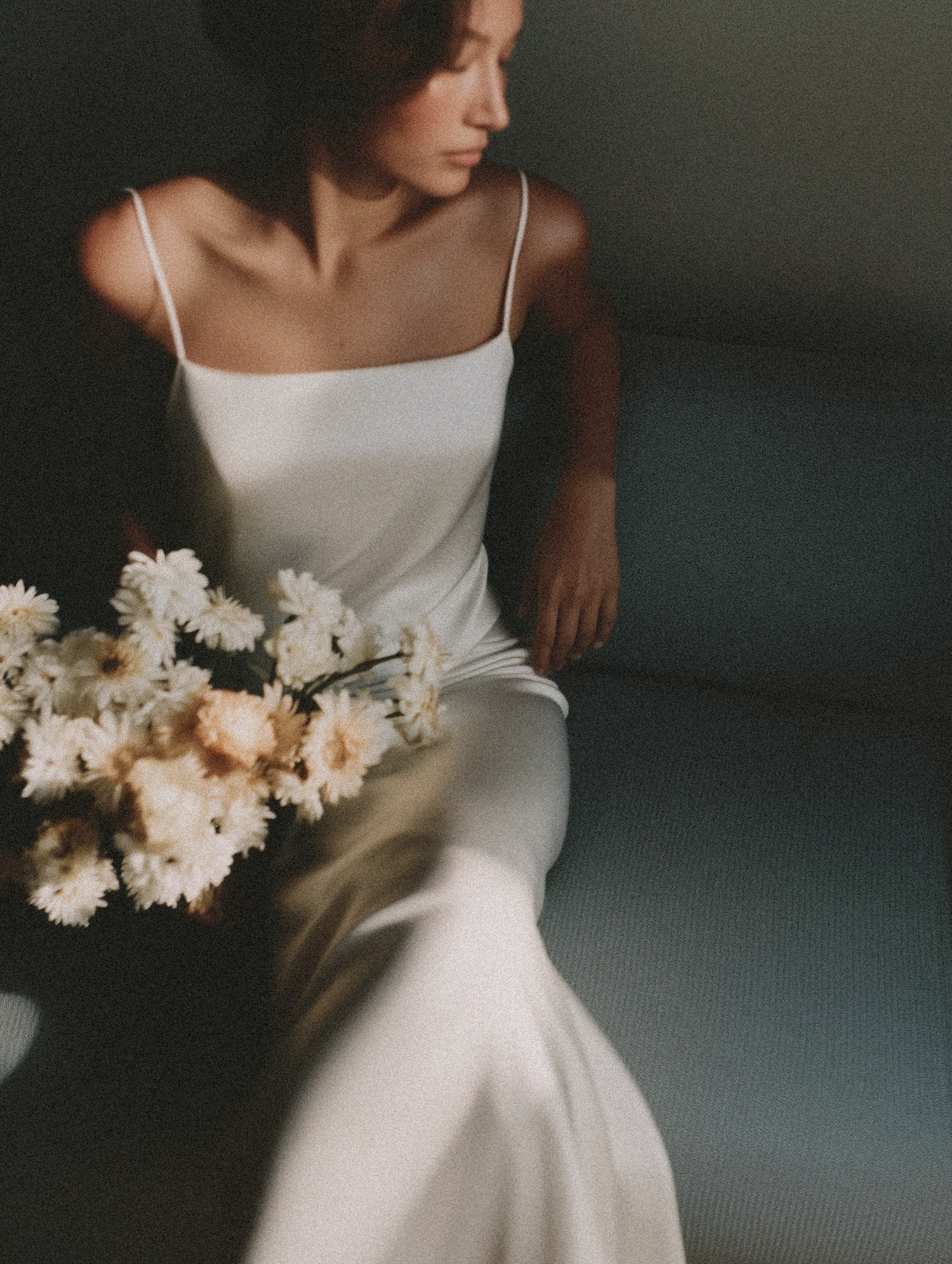 Elegant woman in a white dress holding daisies, soft lighting with a serene and relaxed ambiance.