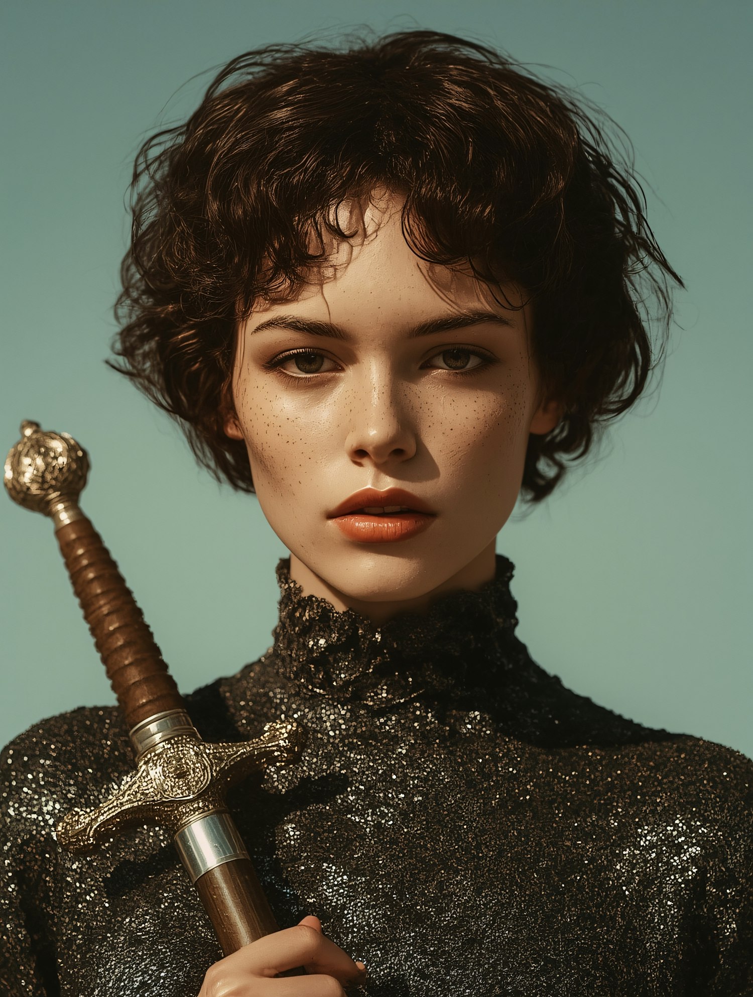 A striking portrait of a young woman with short hair, freckles, and a glittery black top, holding an ornate sword against a light blue background.