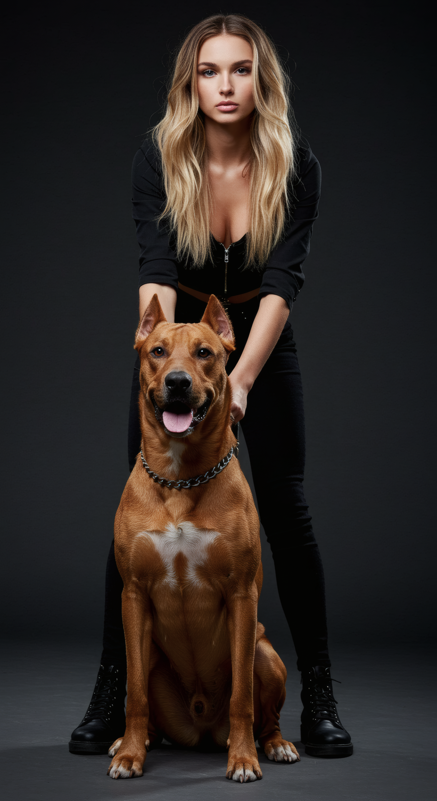 Confident woman with long blonde hair poses with a large brown dog against a dark background, exuding strength and elegance.