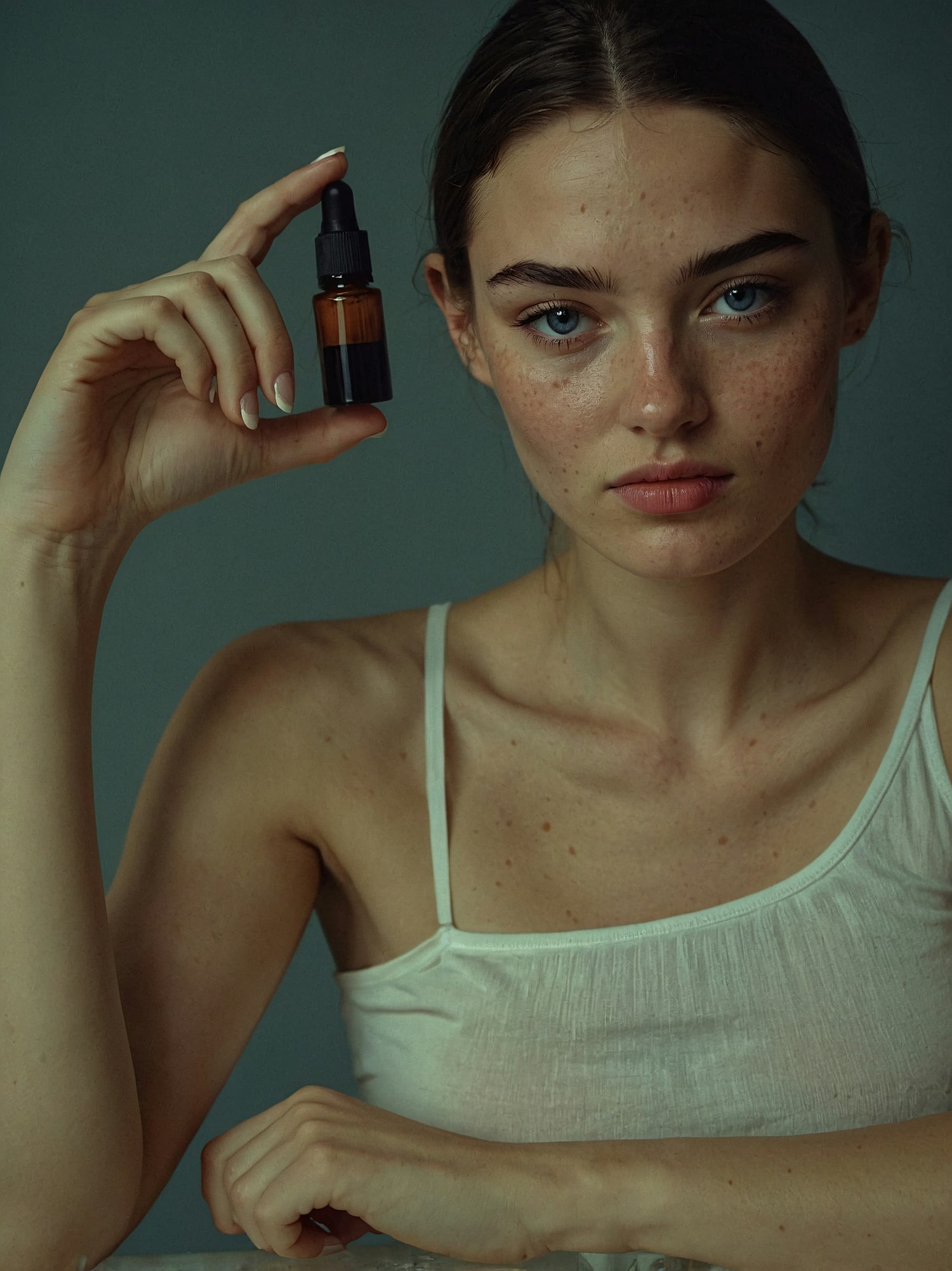Freckled woman with blue eyes holding an amber dropper bottle, wearing a white top against a muted green background.