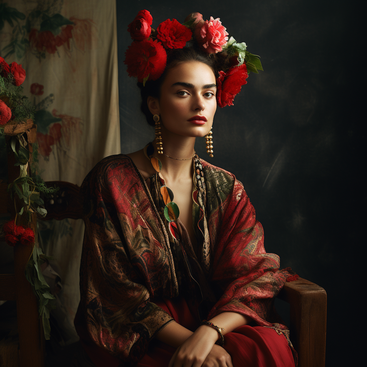 Elegant woman with floral headpiece and ornate jewelry in a richly patterned shawl, set against a dark, muted background.