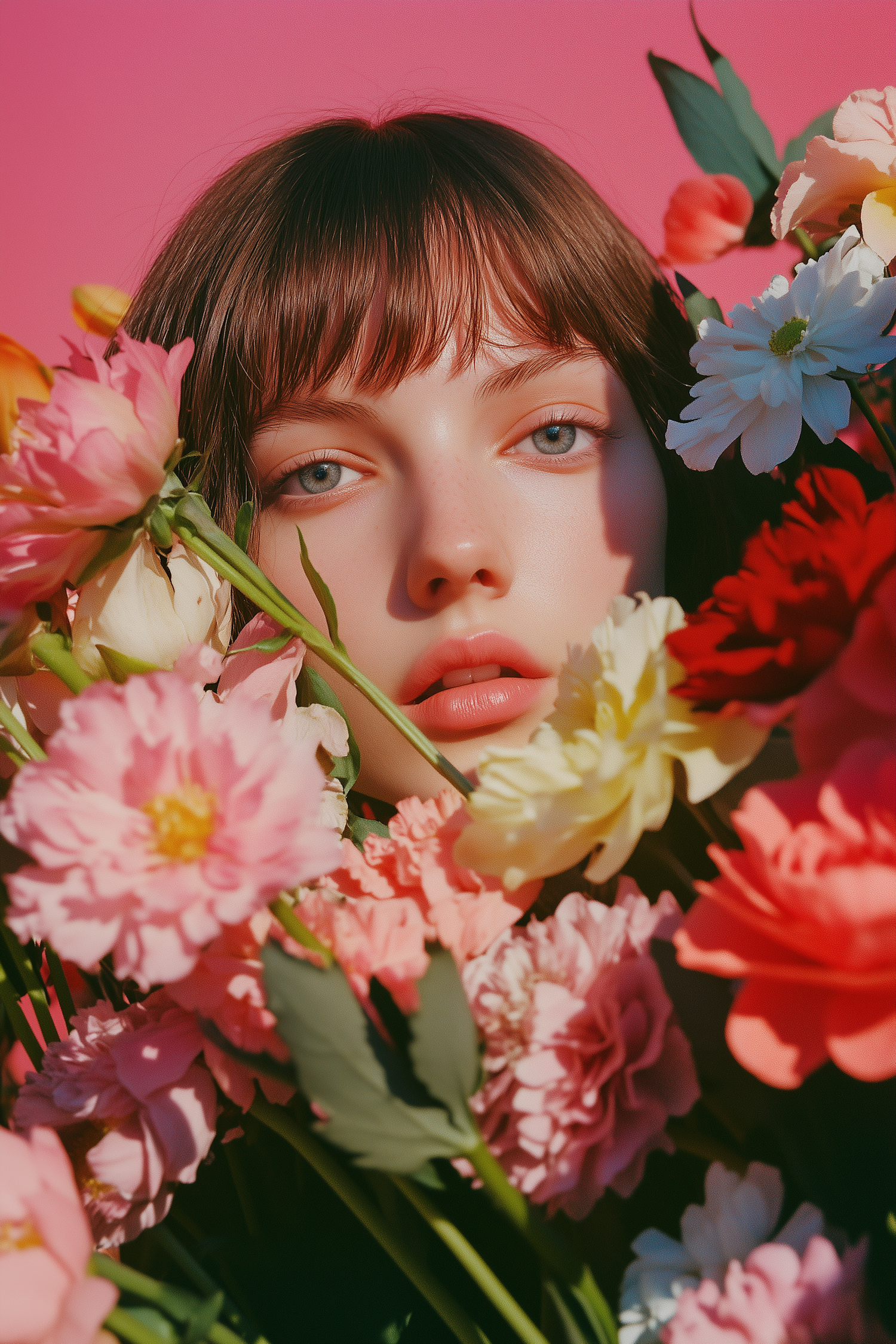 A serene portrait of a young woman surrounded by vibrant pink, red, and yellow flowers against a solid pink background.