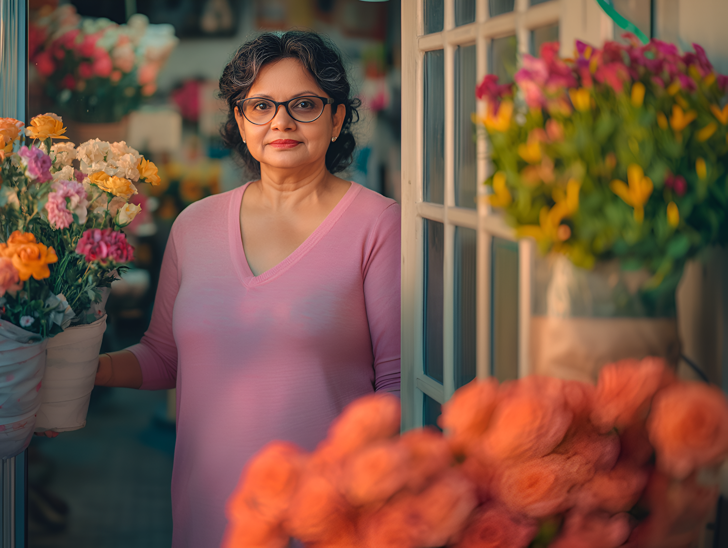 Middle-aged woman in a flower shop, surrounded by colorful blooms, wearing a pink top and glasses, holding a pot of flowers.