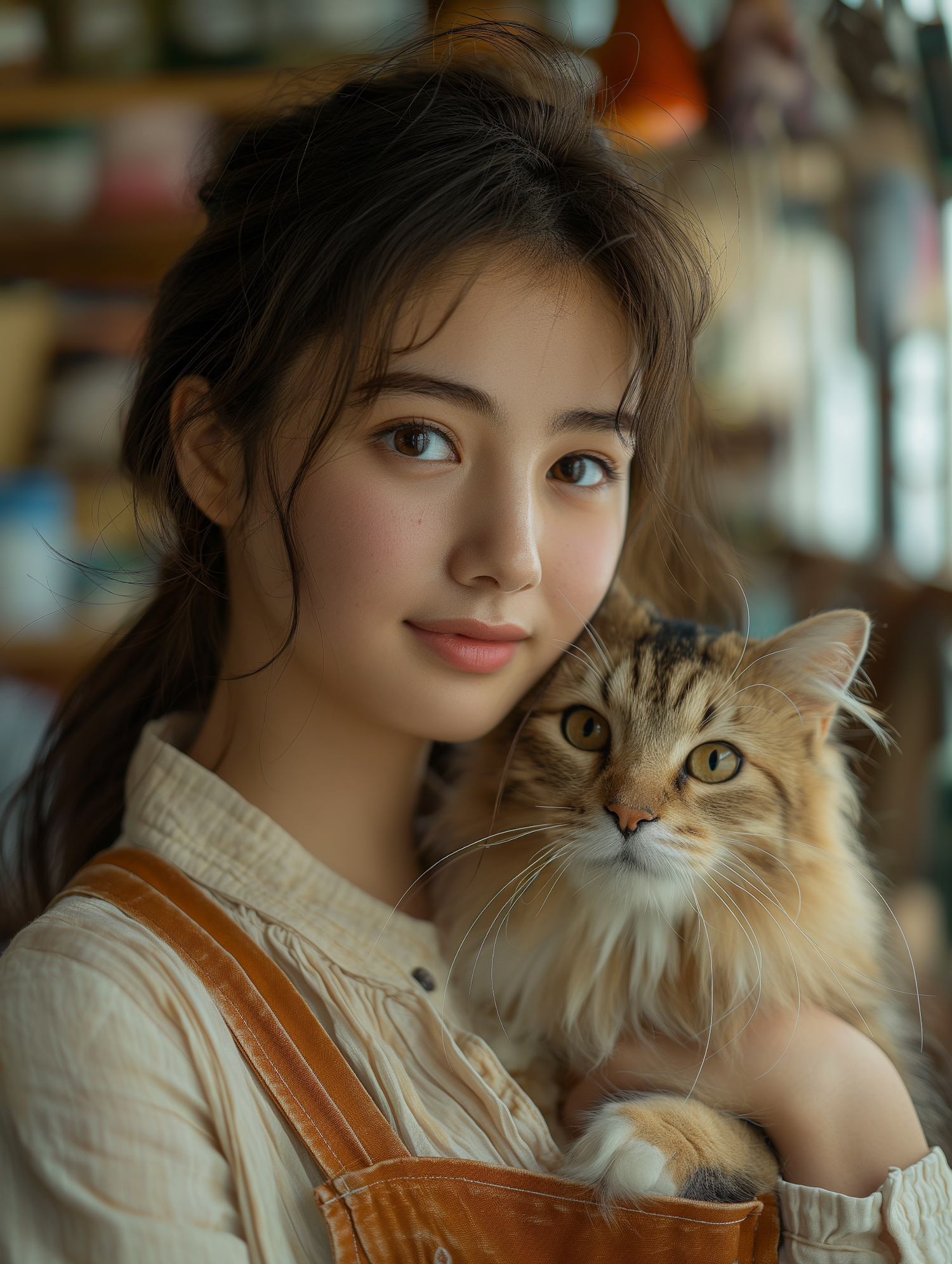 Young woman with dark hair and a fluffy cat, both looking at the camera in a warm, softly lit indoor setting.