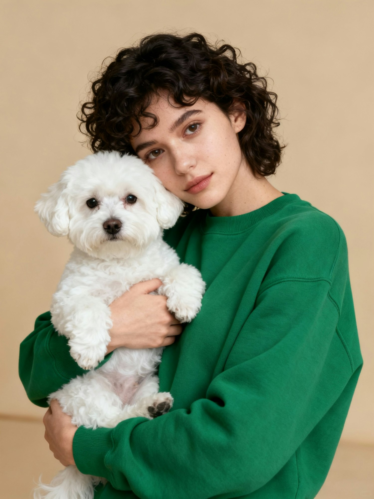 Studio portrait photography of a model with a dog. Soft beige background, perfectly uniform, seamless, no floor line. Flat diffused lighting, shadowless, evenly lit, natural skin tones, warm atmosphere. Minimal and intimate composition, both model and dog close to camera, side by side or gently interacting. Calm expressions, natural styling, no exaggerated posing. High resolution, sharp, simple and authentic mood. A young woman with curly dark hair, dressed in a green crewneck sweater, holds a small white bichon frisé close to her chest. The dog looks forward while the woman’s head leans gently against it