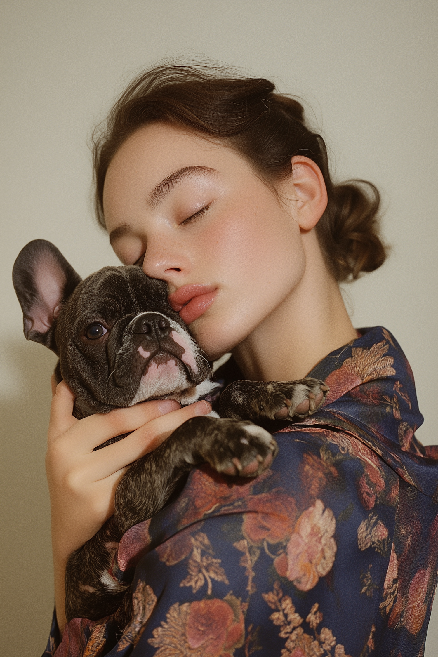 A serene moment of a woman embracing a French Bulldog puppy, showcasing affection and elegance with a floral robe.