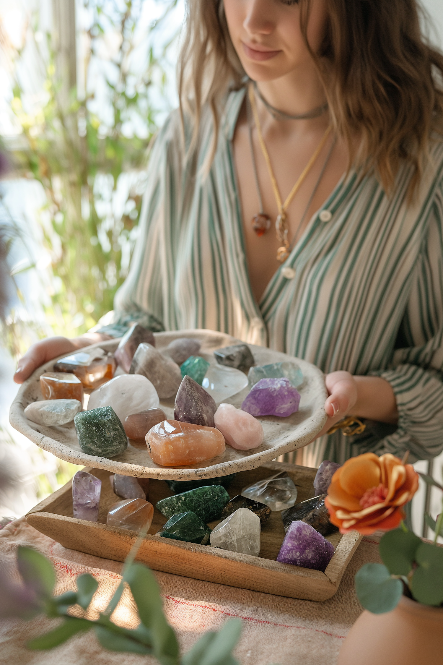 Woman holding a tray of colorful crystals and stones, wearing striped blouse and necklaces, with a vibrant orange flower in the foreground.