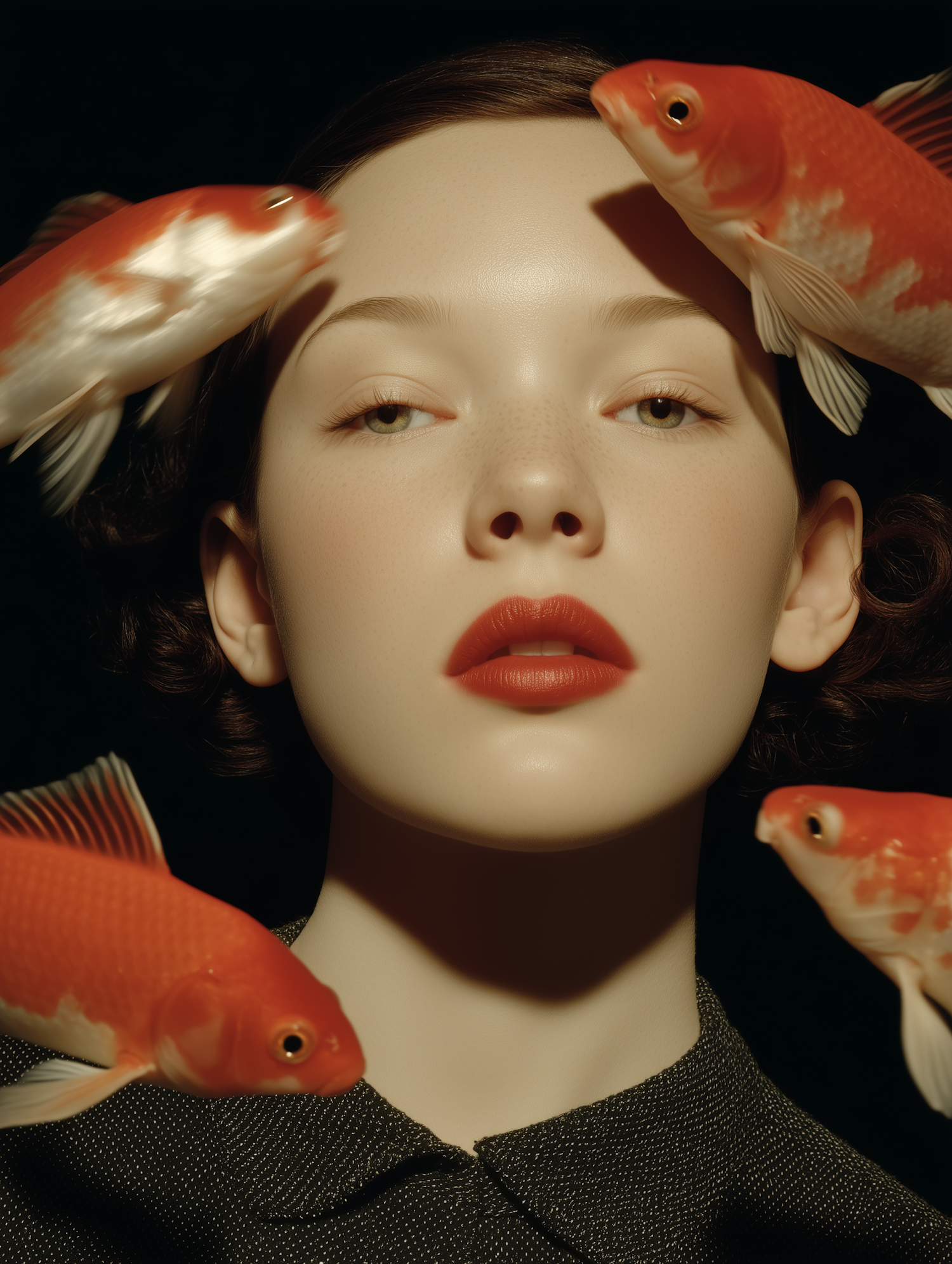 A surreal portrait of a woman with bold red lips surrounded by vibrant goldfish against a dark background.