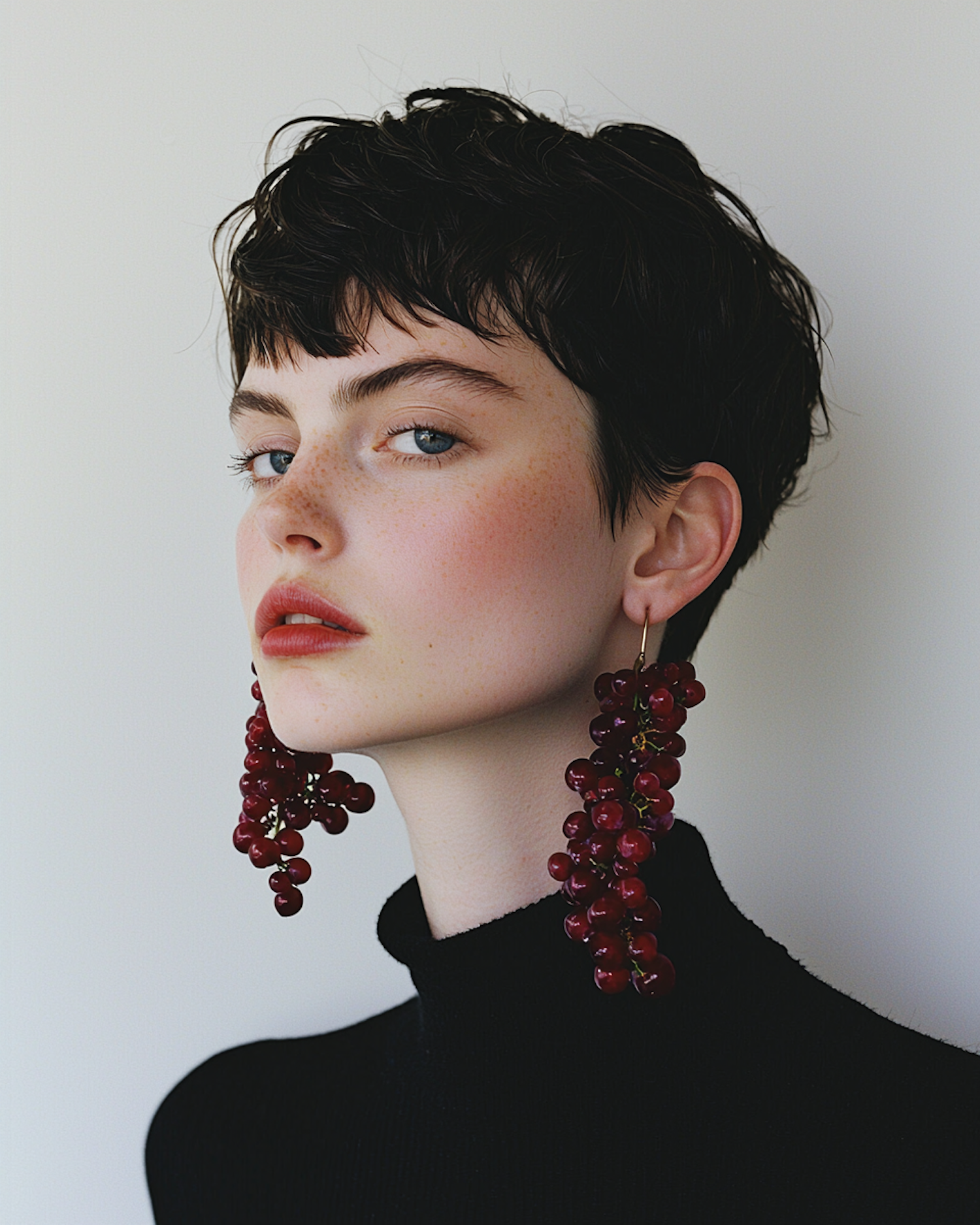 Stylish woman with short dark hair, bold red lips, and grape earrings, wearing a black turtleneck against a neutral background.