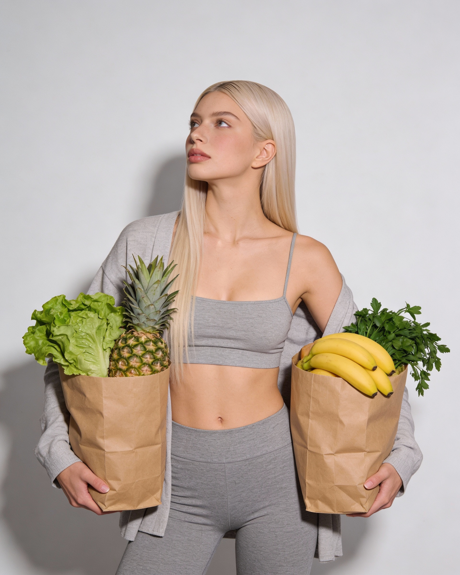 A woman in gray activewear holds two paper bags filled with fresh produce, including bananas and a pineapple, against a plain background.