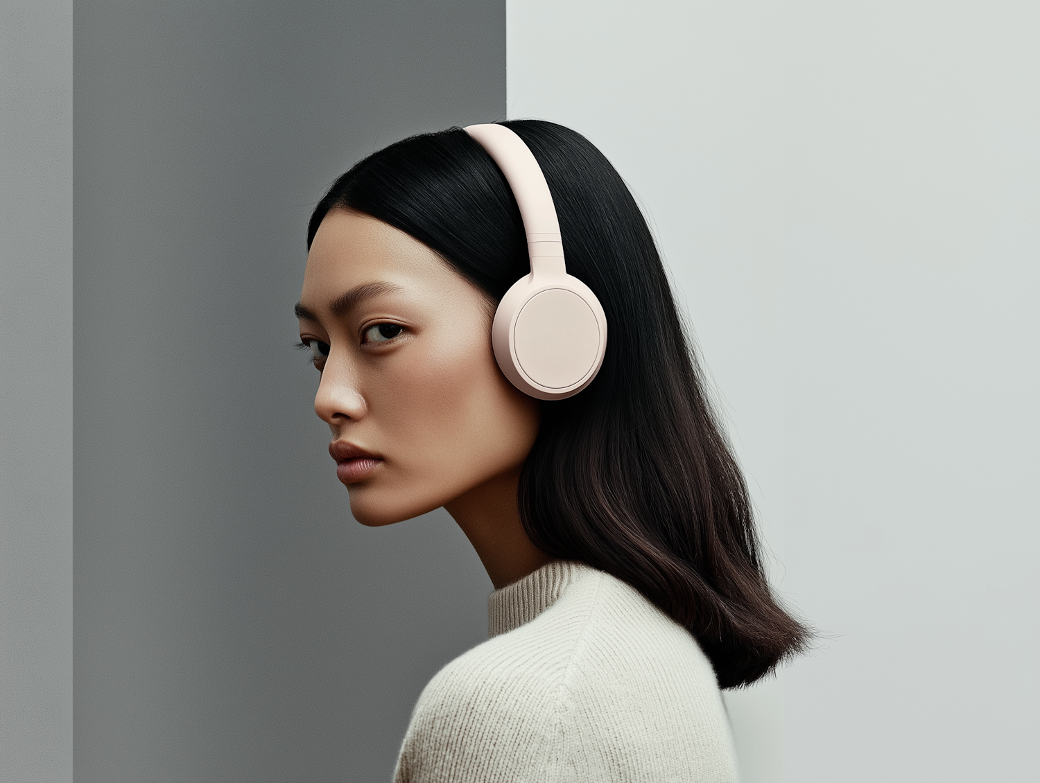 Minimalist portrait of a woman wearing beige over-ear headphones, set against a muted gray background. Modern and serene vibe.