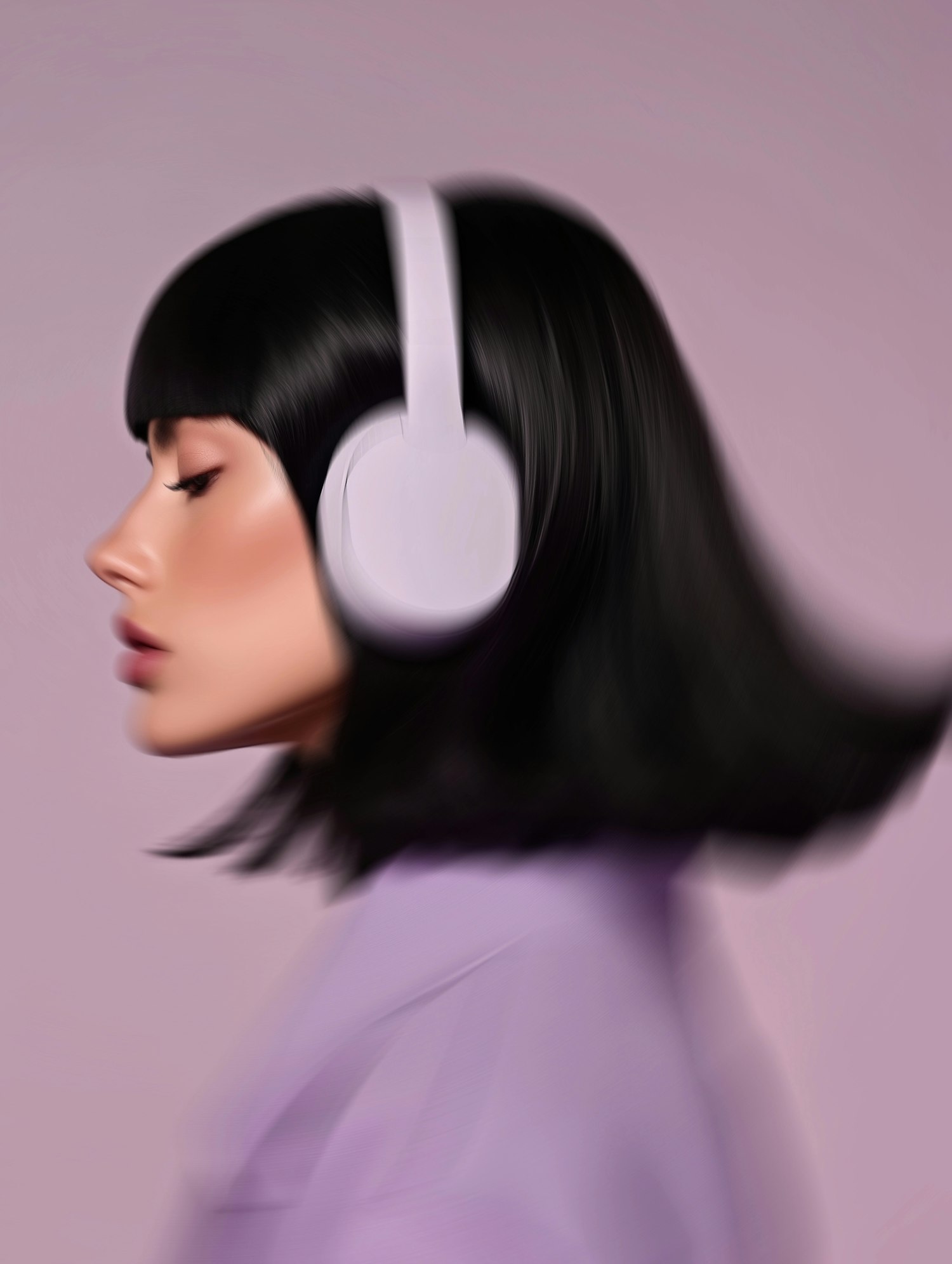 Side profile of a woman with sleek black hair, white headphones, and a lavender top against a soft pink background. Modern and artistic vibe.