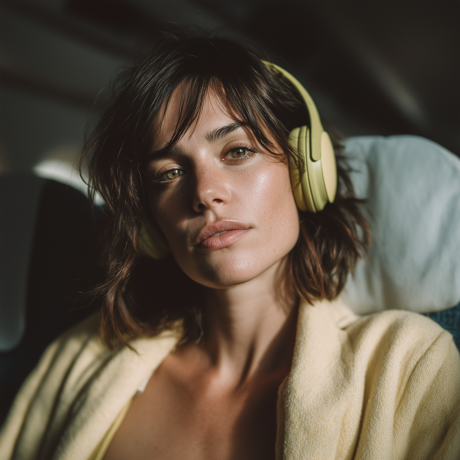 A woman with short brown hair and yellow headphones sits in a dimly lit space, possibly traveling, with a calm and neutral expression.