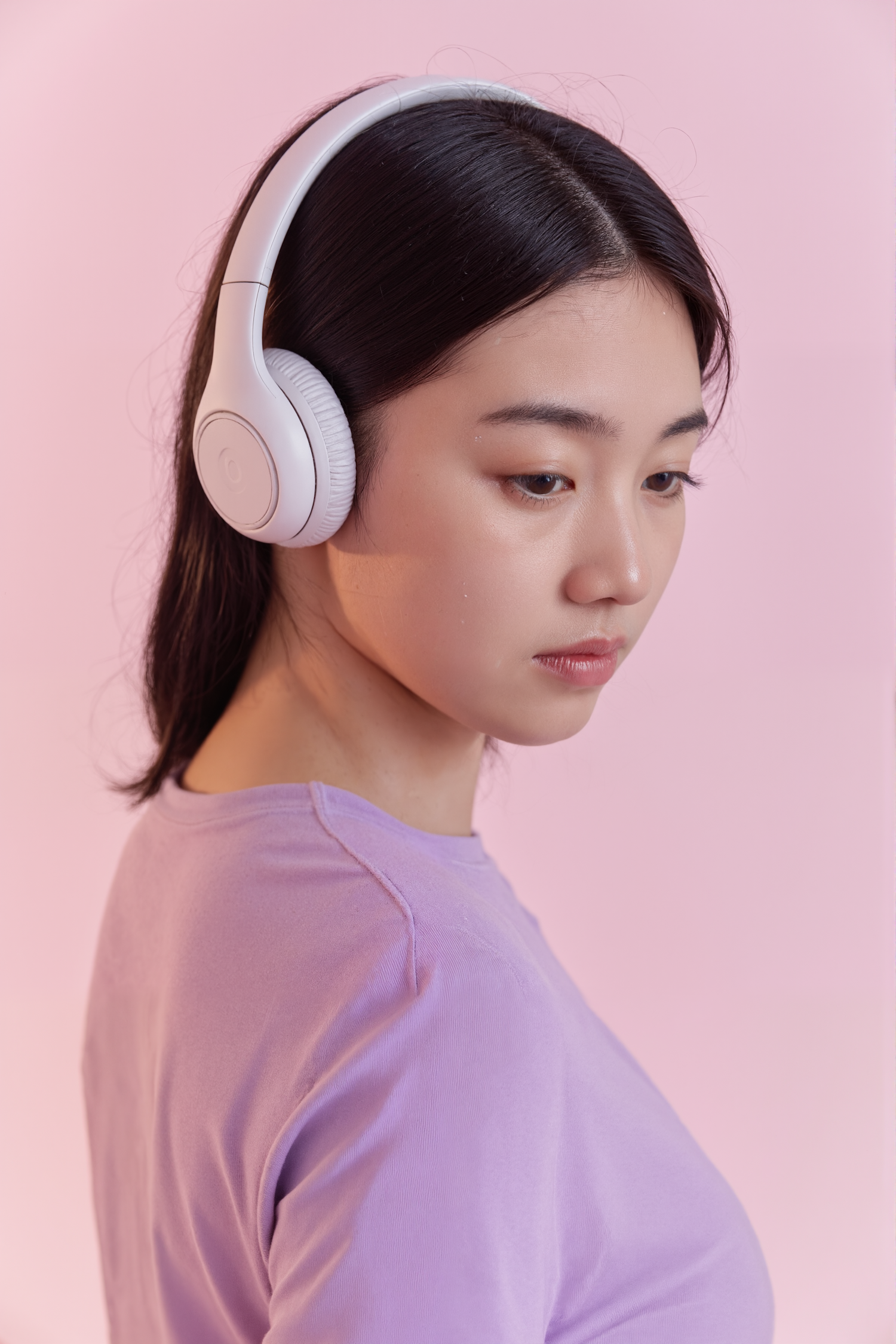 Young woman in white headphones and a purple shirt, gazing downward against a pastel pink background. Minimalist and serene vibe.