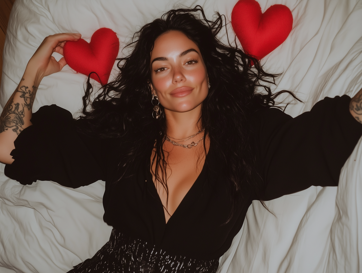 Woman with black hair and tattoos lies on a bed holding red heart cushions, exuding a relaxed and cozy vibe.