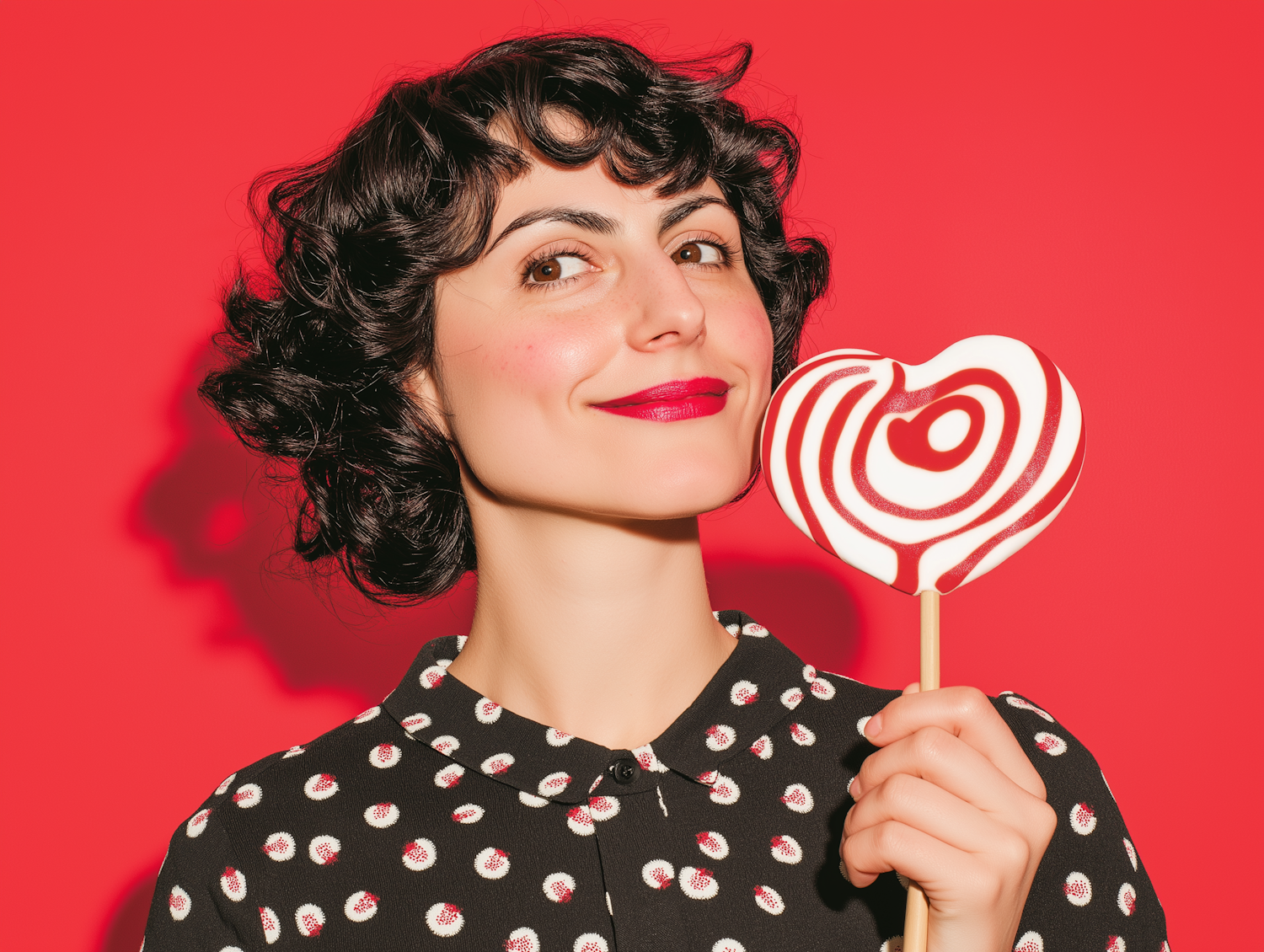 Woman with curly black hair holding a heart-shaped lollipop against a red background, wearing a polka dot blouse.