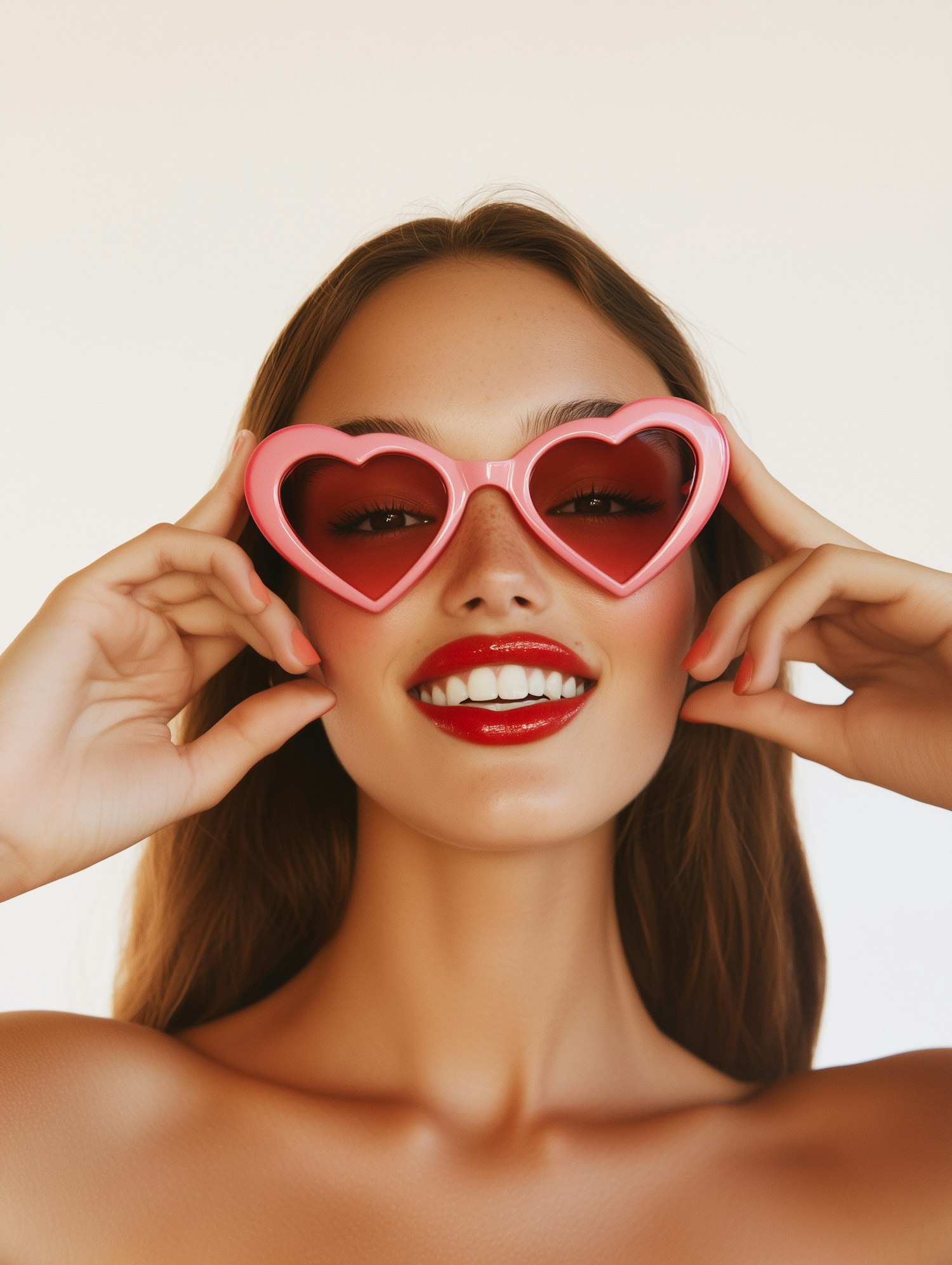 Stylish woman with pink heart-shaped sunglasses, glossy red lips, and a cheerful smile against a neutral background.