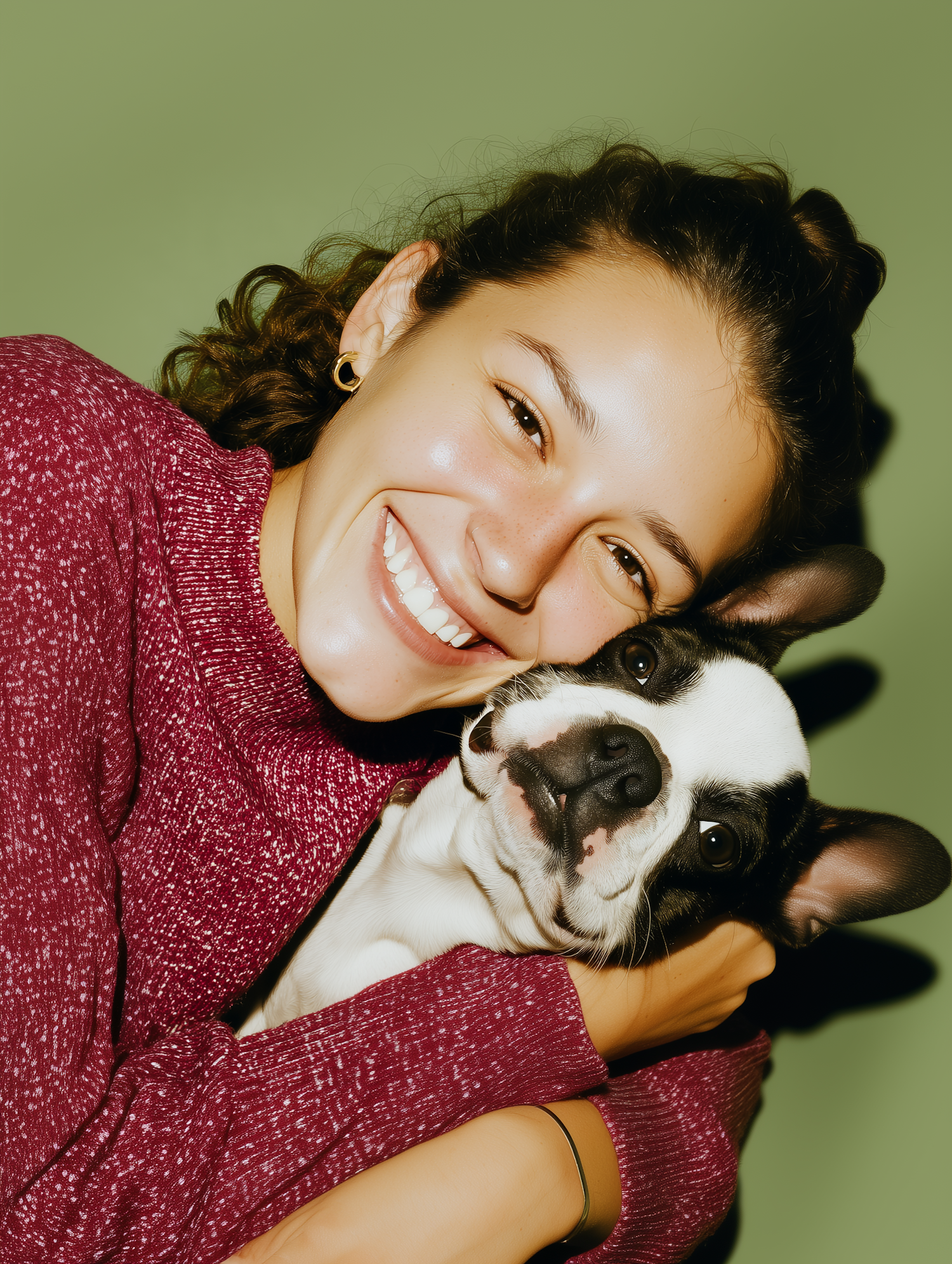 A cheerful woman in a red sweater hugs her adorable black and white dog against a green background, radiating happiness and love.