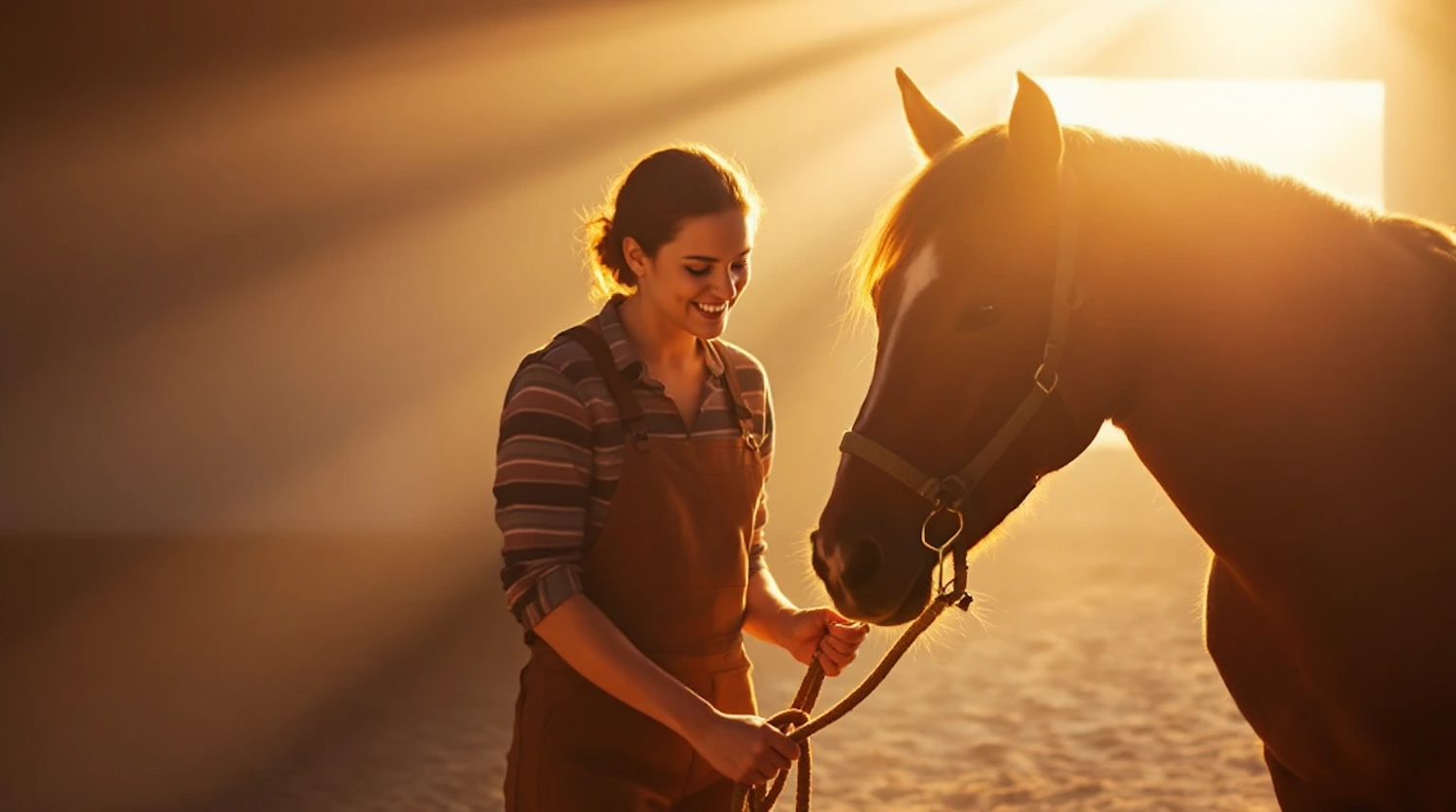 A woman in overalls smiles warmly while holding a horse's reins in golden sunlight, creating a serene and heartfelt moment.