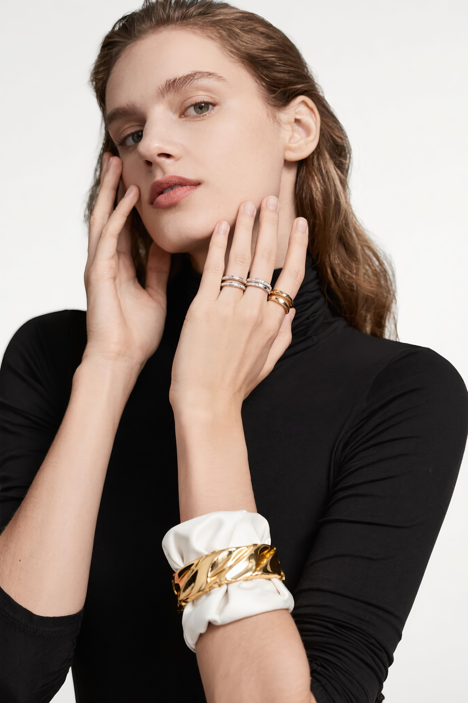 Elegant woman in a black turtleneck showcasing gold and silver rings and a stylish bracelet with a white and gold design.