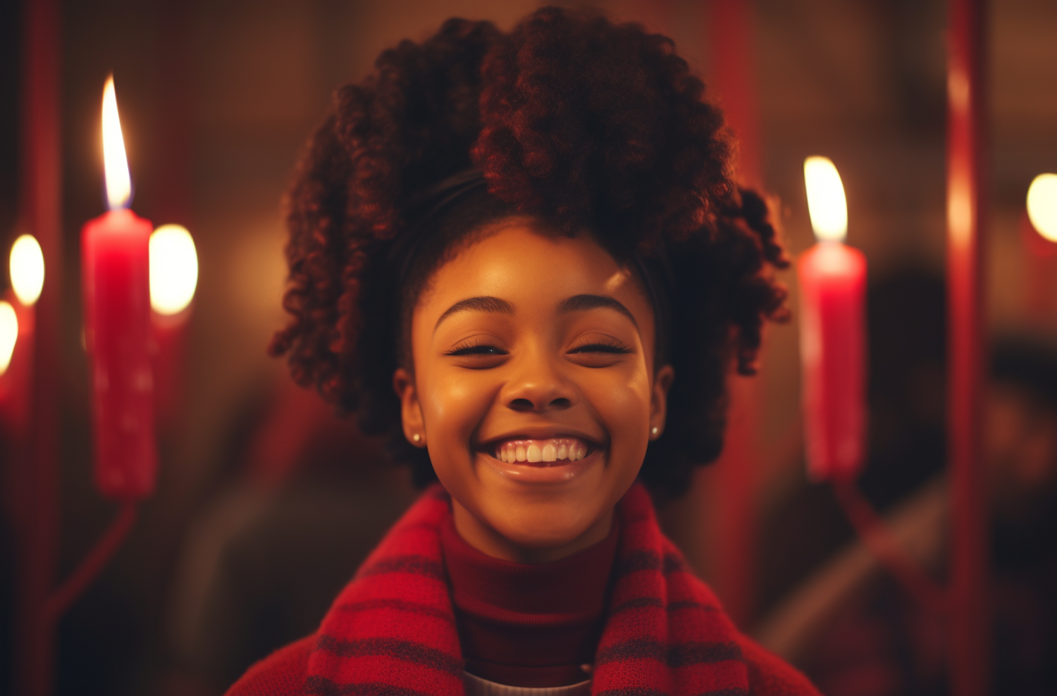 Smiling young woman with curly hair in a cozy, candle-lit setting, wearing a red scarf. Warm and festive atmosphere.