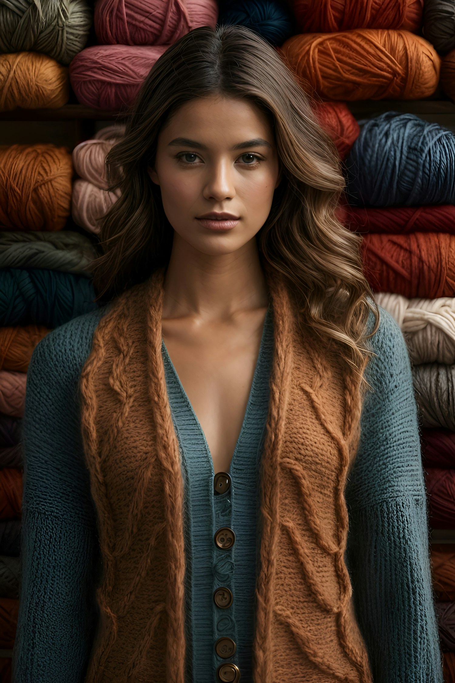 Woman with brown hair in a blue sweater and brown scarf, standing before colorful yarn display. Calm expression, vibrant and cozy setting.