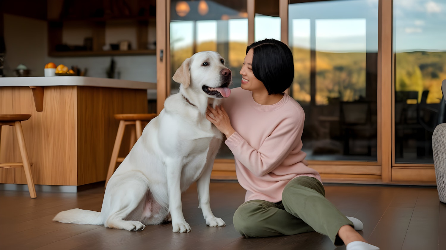 A woman in a pink sweater sits on the floor, smiling at her white Labrador in a cozy home with wooden accents and scenic views.