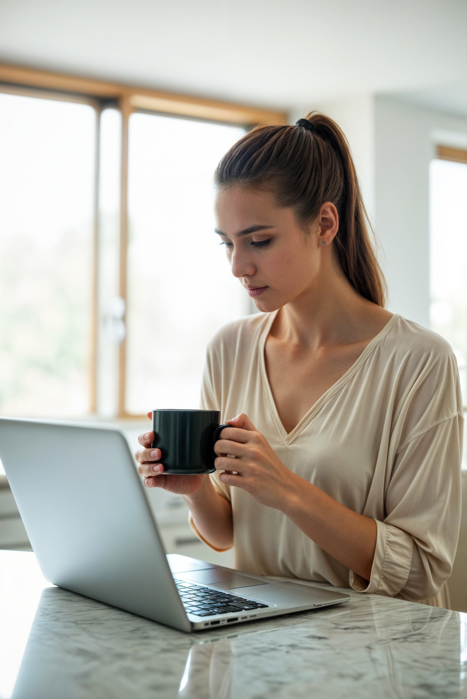 Young woman with ponytail holding a coffee mug, working on a laptop at a marble countertop in a bright room.