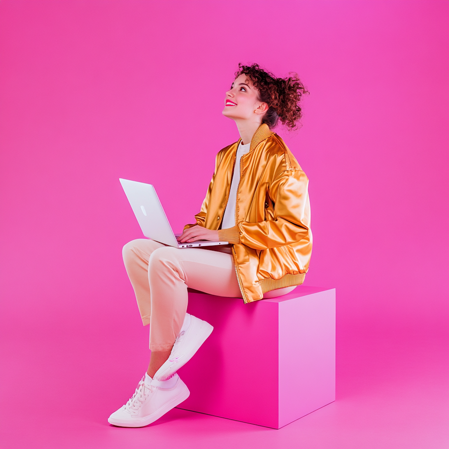 Young woman in gold jacket with laptop on pink cube, vibrant pink background. Modern and colorful scene.