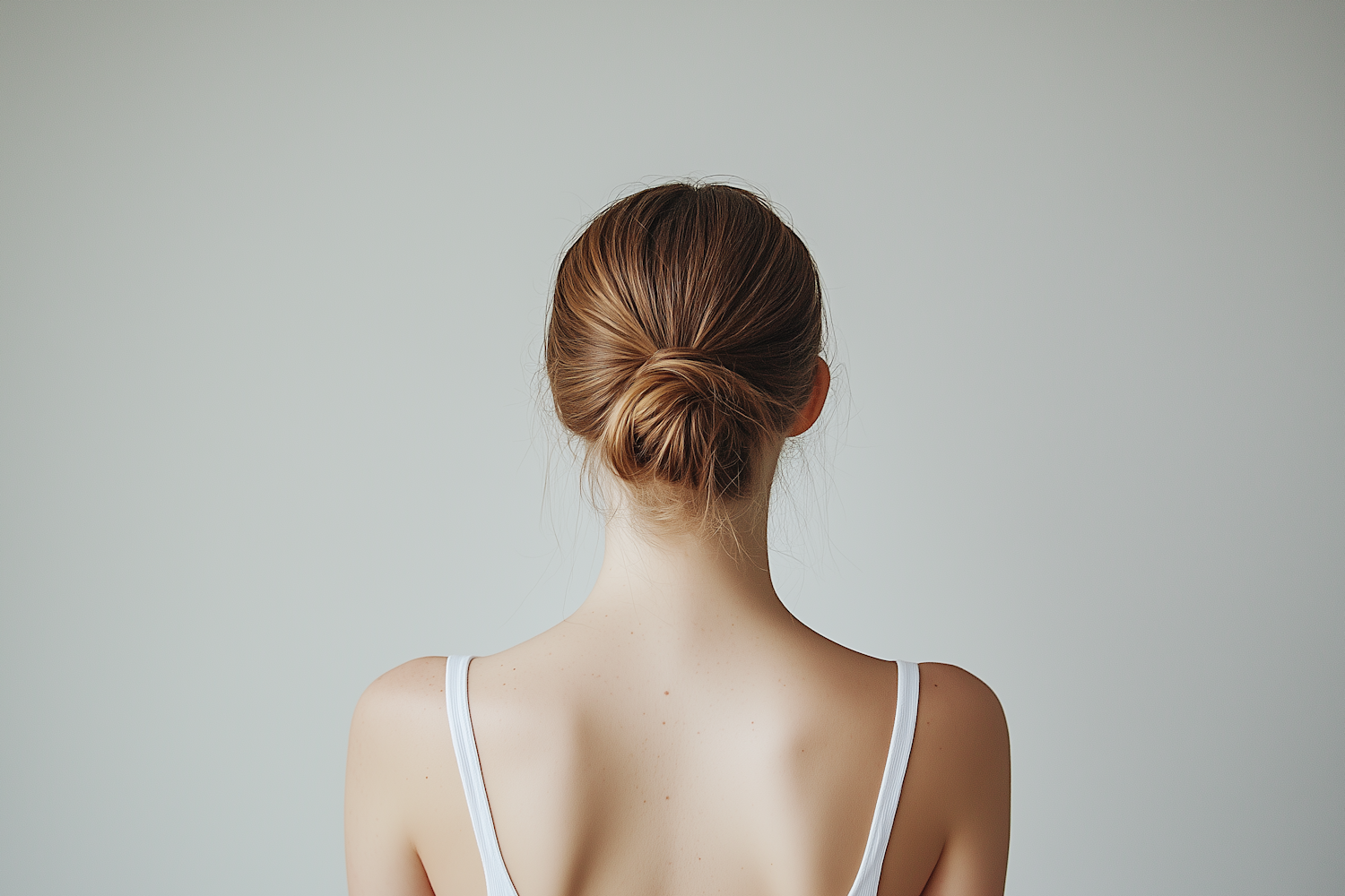 Minimalist shot of a woman with light brown hair in a low bun, wearing a white tank top, against a plain gray background.
