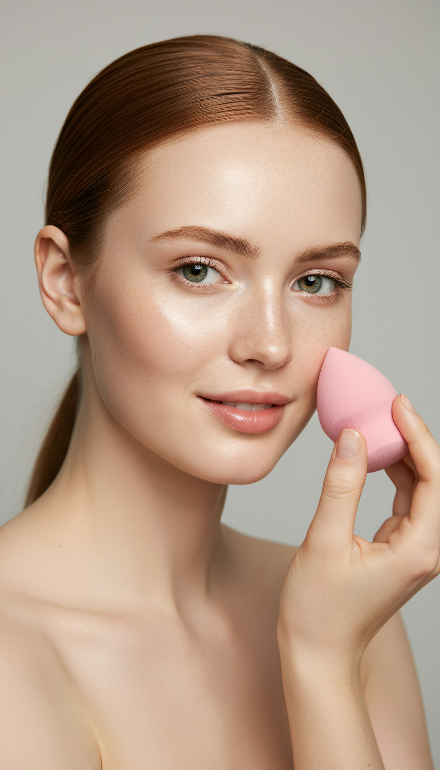 A young woman with fair skin and auburn hair uses a pink makeup sponge, showcasing a smooth complexion and natural beauty.