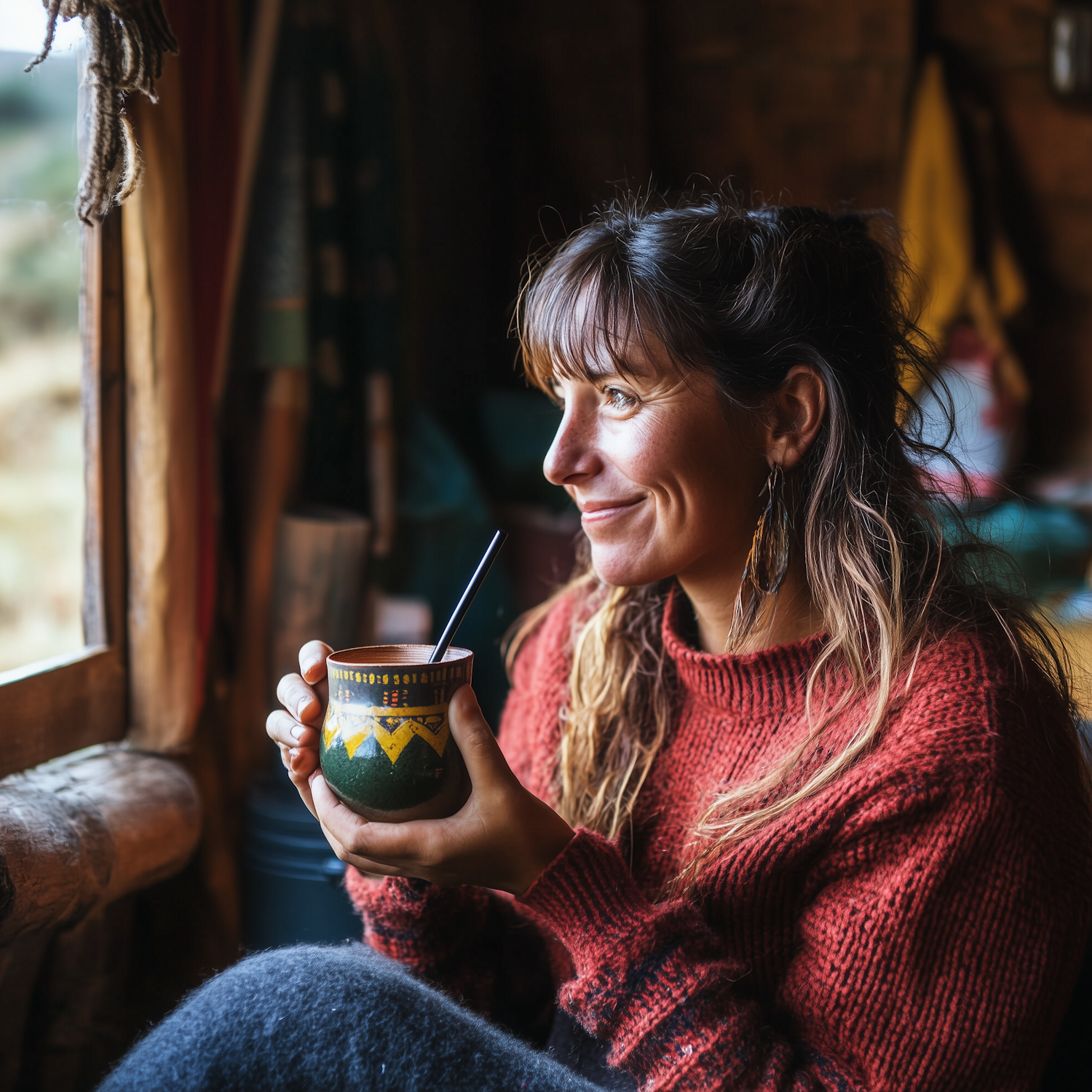 A woman in a red sweater enjoys a mate drink by a rustic window, her serene smile lit by natural light in a cozy, wooden interior.
