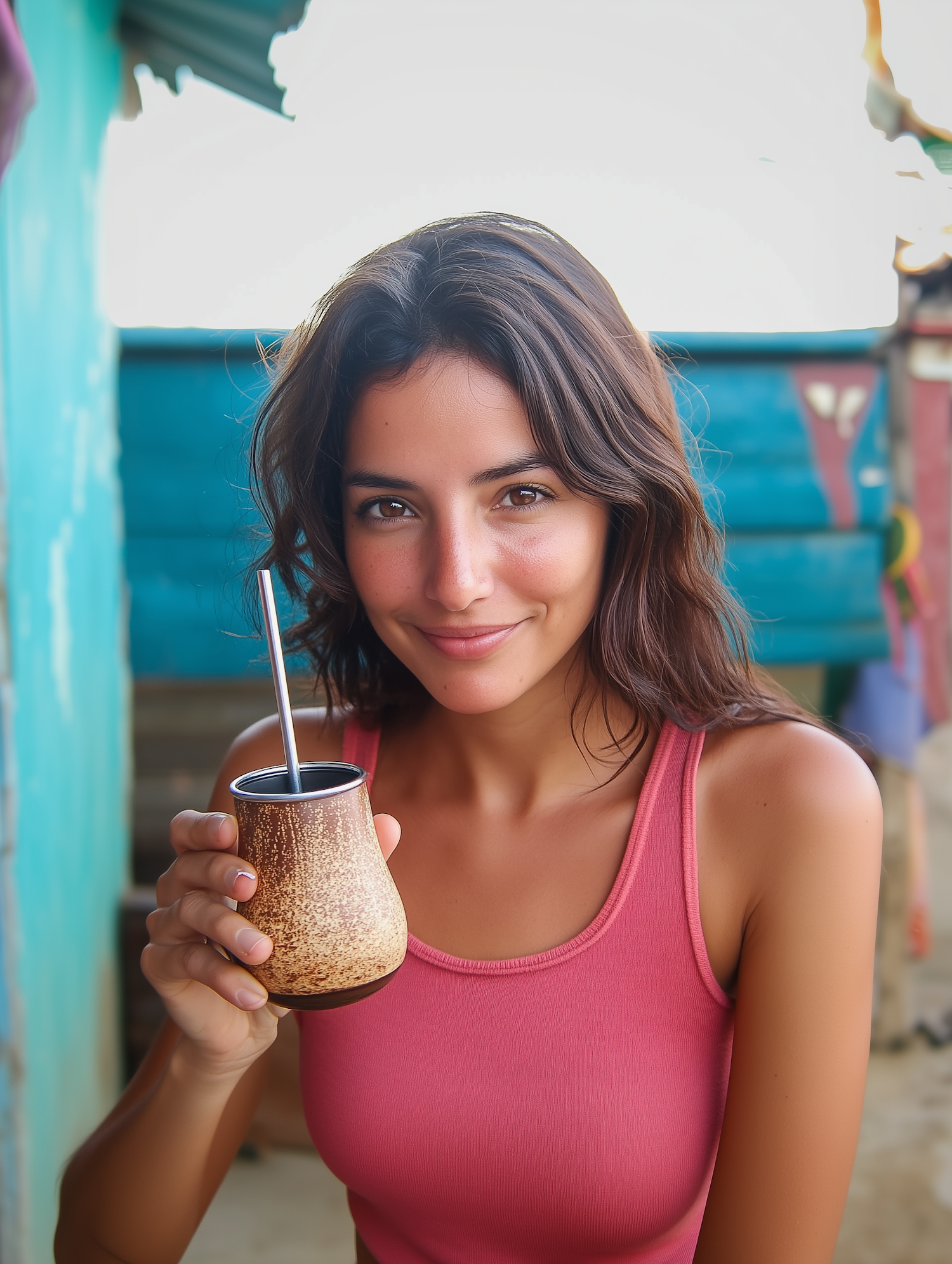 A woman in a pink top enjoys a traditional mate drink outdoors, with a rustic teal and blue backdrop adding charm to the scene.