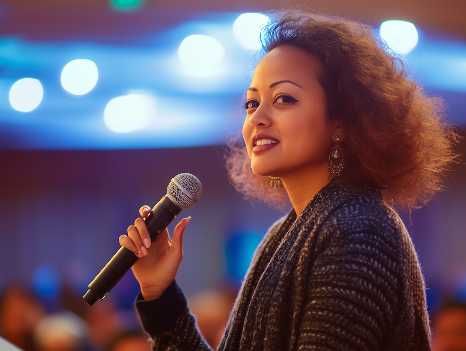 Confident woman with curly hair holding a microphone, wearing elegant earrings, against a vibrant, blurred background with bokeh lights.